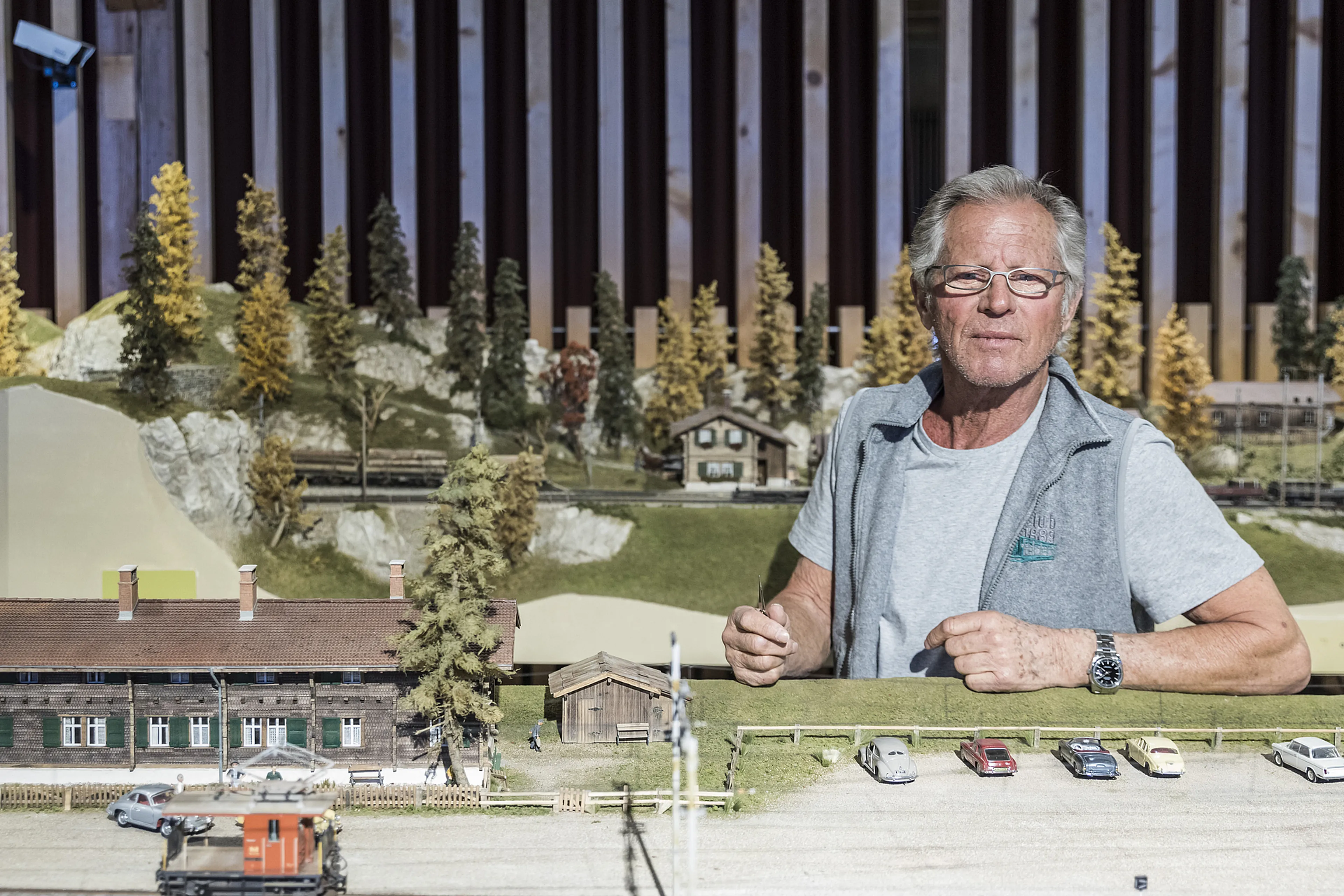 Opvallend in het museum is de prachtige modelspoorbaan van een deel van de Rhätische Bahn. We treffen er een excentrieke, wat oudere heer: Bernhard Tarnutzer. Hij vertelt hoe hij aanvankelijk thuis aan het enorme modelspoortraject begon. “Het museum heeft me op een gegeven moment gevraagd of ik mijn modelspoorbaan niet wilde verplaatsen en uitbreiden. Toen mocht ik er hier verder aan knutselen,” vertelt hij.