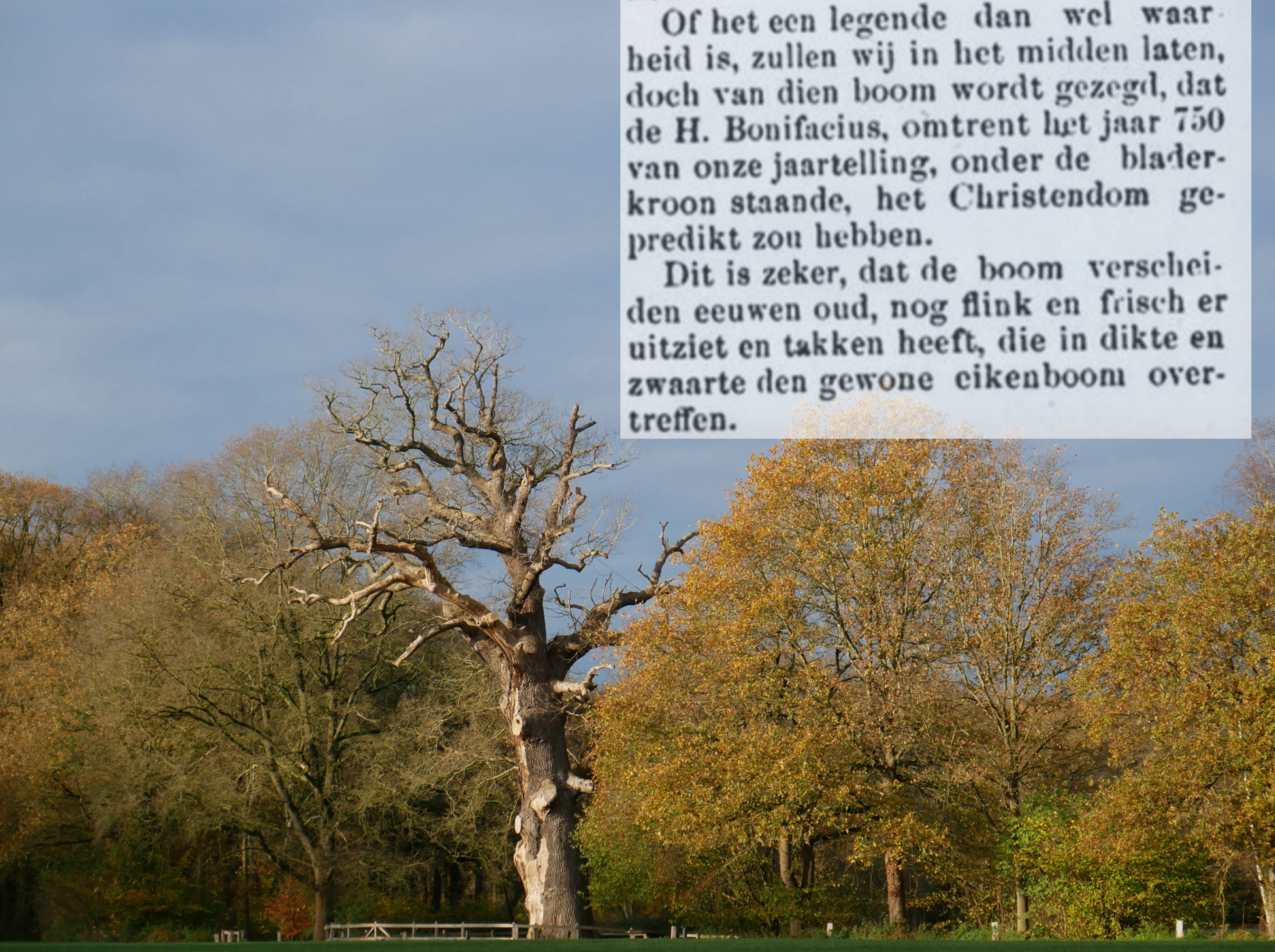Een van de legendes die bij de dikste eik hoort is deze: ‘Van deze boom wordt gezegd dat de heilige Bonifatius in het jaar 750 van onze jaartelling onder de bladerkroon staande, het Christendom gepredikt zou hebben.’ Het is typerend voor oude eiken. Bij deze bomen fantaseren mensen graag bijzondere verhalen, vertelt Wim Eikelboom in de podcast Eik & Ik.