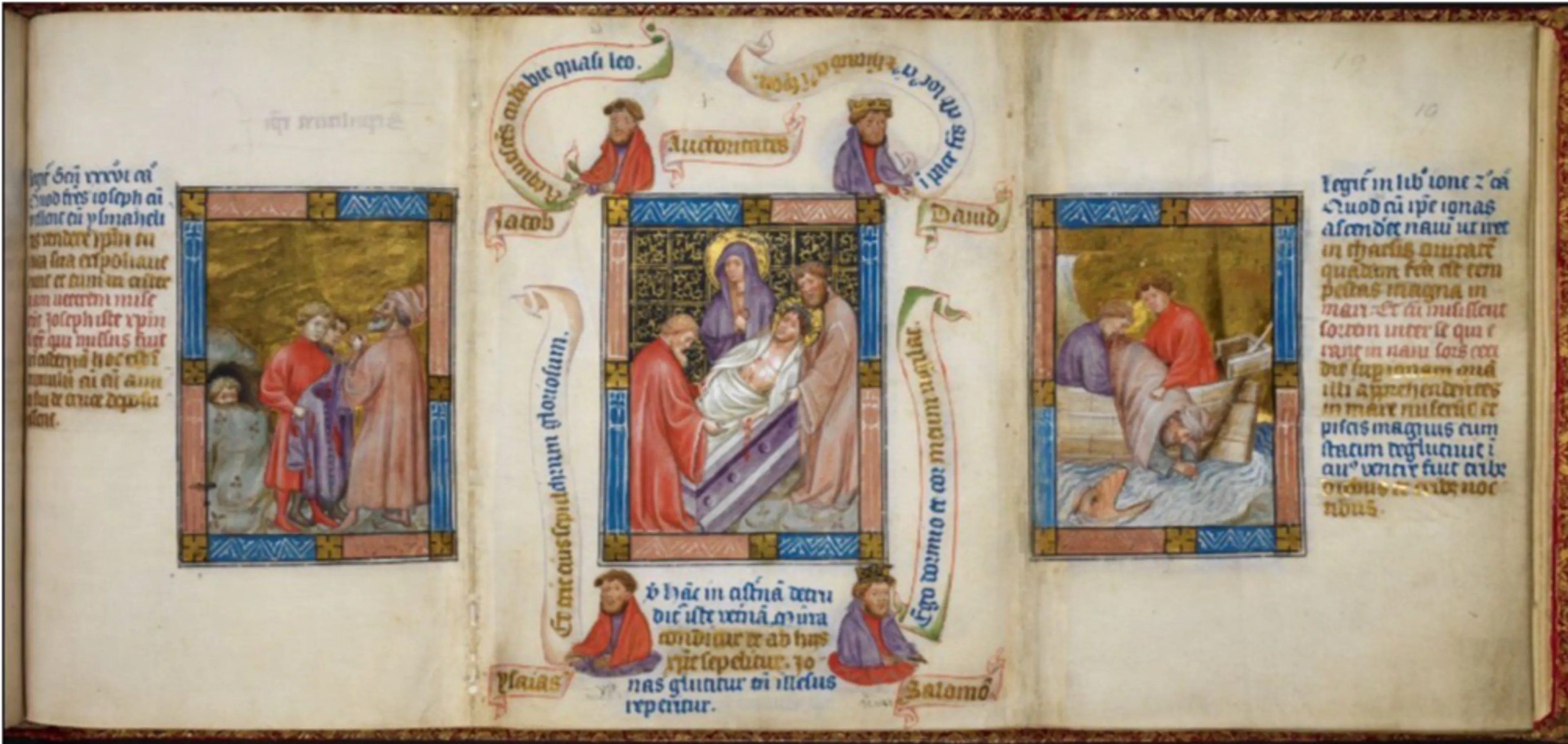 Die laatste twee zijn hierboven afgebeeld, links en rechts, in een zogeheten ‘armenbijbel’. Met plaatjes dus. Het in de put gooien van Jozef en in het water gooien van Jona, zijn daar gelinkt aan het in het graf leggen van Jezus. En we weten wat er met Jozef en Jona gebeurde, dus…