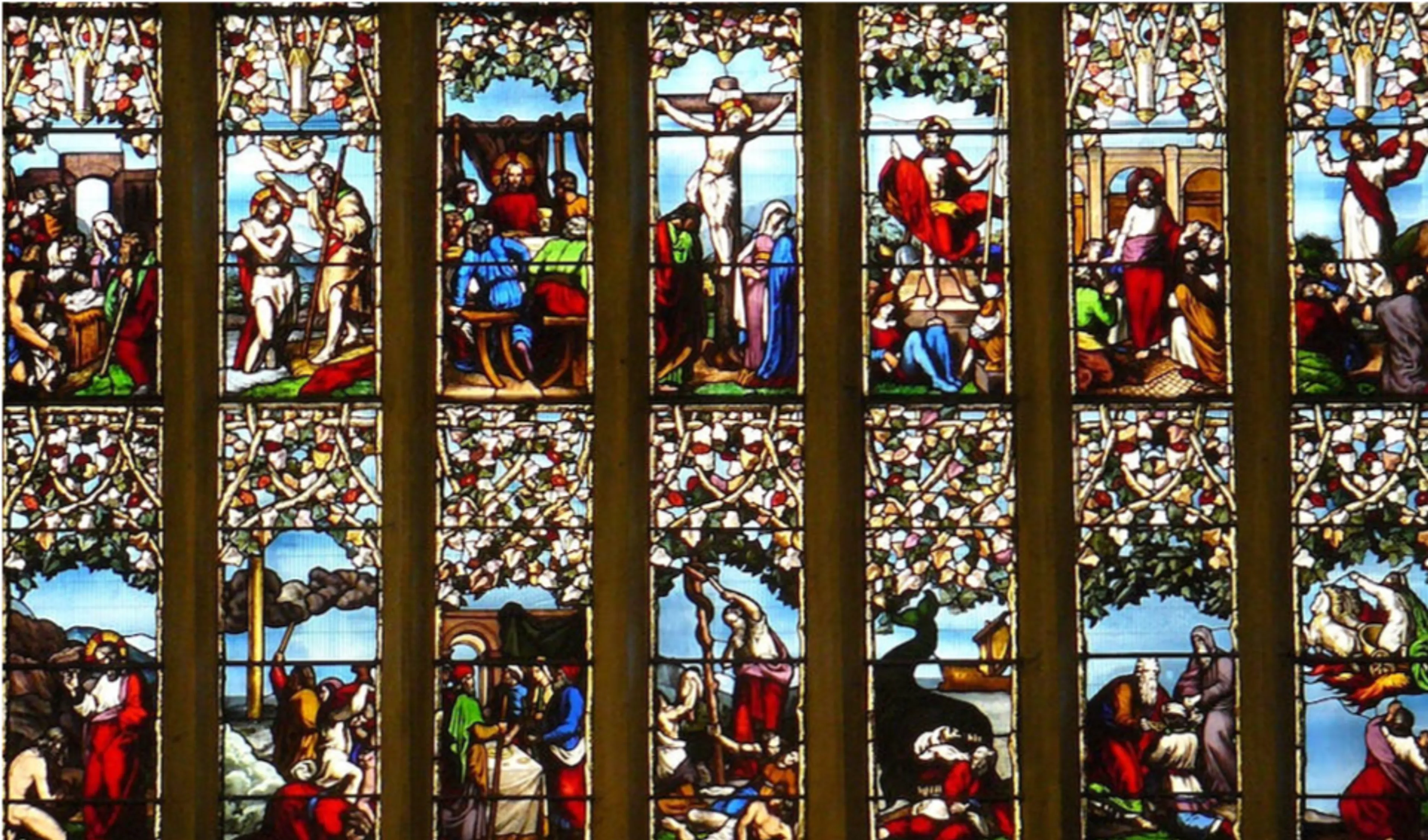 Op dit glas-in-loodraam zie je zelfs zeven links met Jezus. De bovenste rij zijn verhalen over Jezus, daaronder de ‘prefiguraties’ in het Oude Testament. Eentje geef ik weg: Jezus die omhooggericht aan het kruis hangt, wordt eronder vergeleken met Mozes die de koperen slang opheft in de woestijn ter genezing.