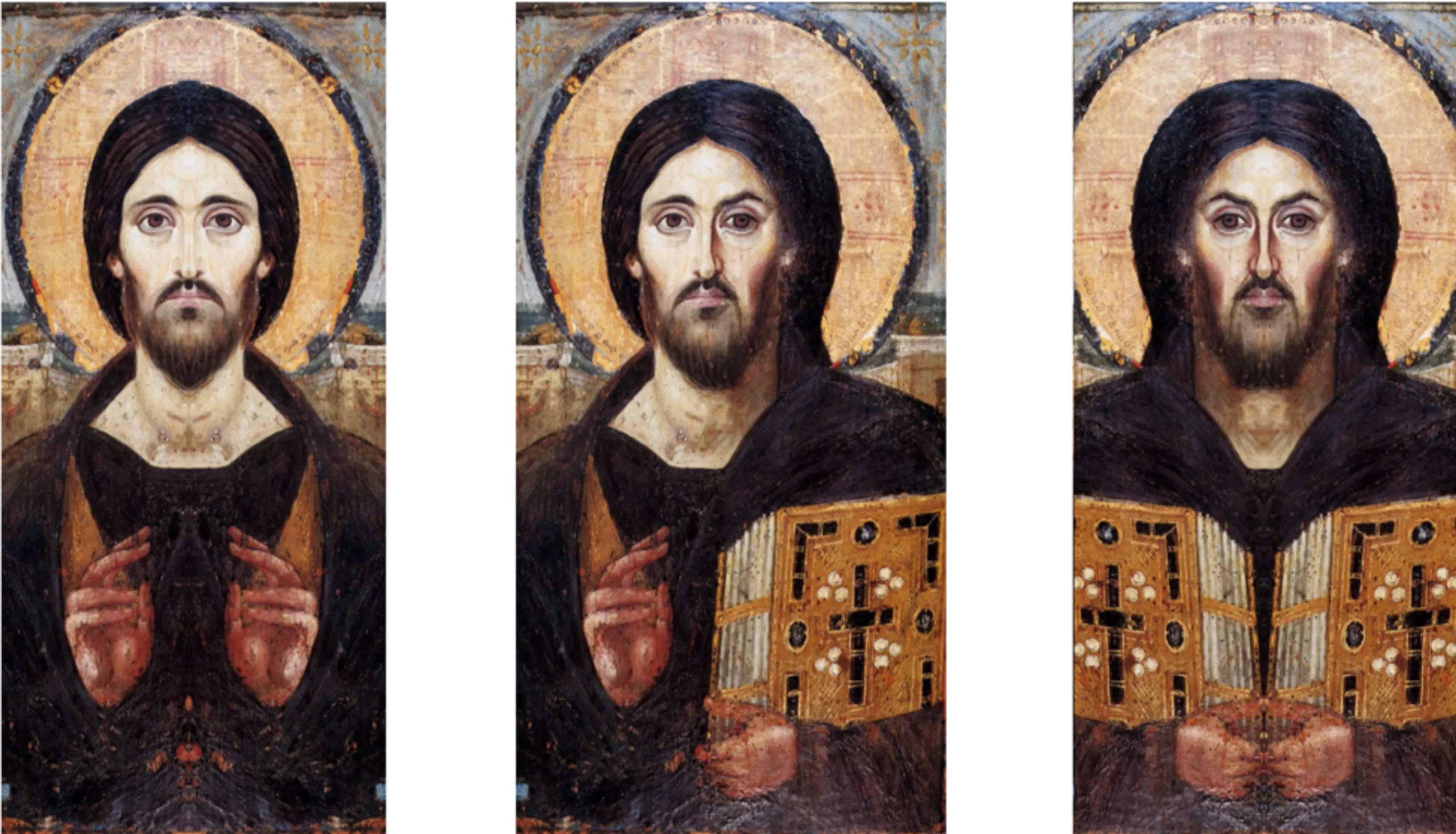 Ik heb voor jouw gemak ook wat zitten fotoshoppen, dit keer niet avant la lettre. In het midden weer het origineel, links de ene kant gespiegeld, rechts de andere kant. Het effect is opmerkelijk, nietwaar? De linker Jezus is – toevallig net als bij Eichmann – een stuk jeugdiger. De rechter Jezus heeft een grotere pupil, kijkt intenser, is wat vermoeider en oogt ouder. De linker Jezus zegent, de rechter houdt het boek des levens vast.