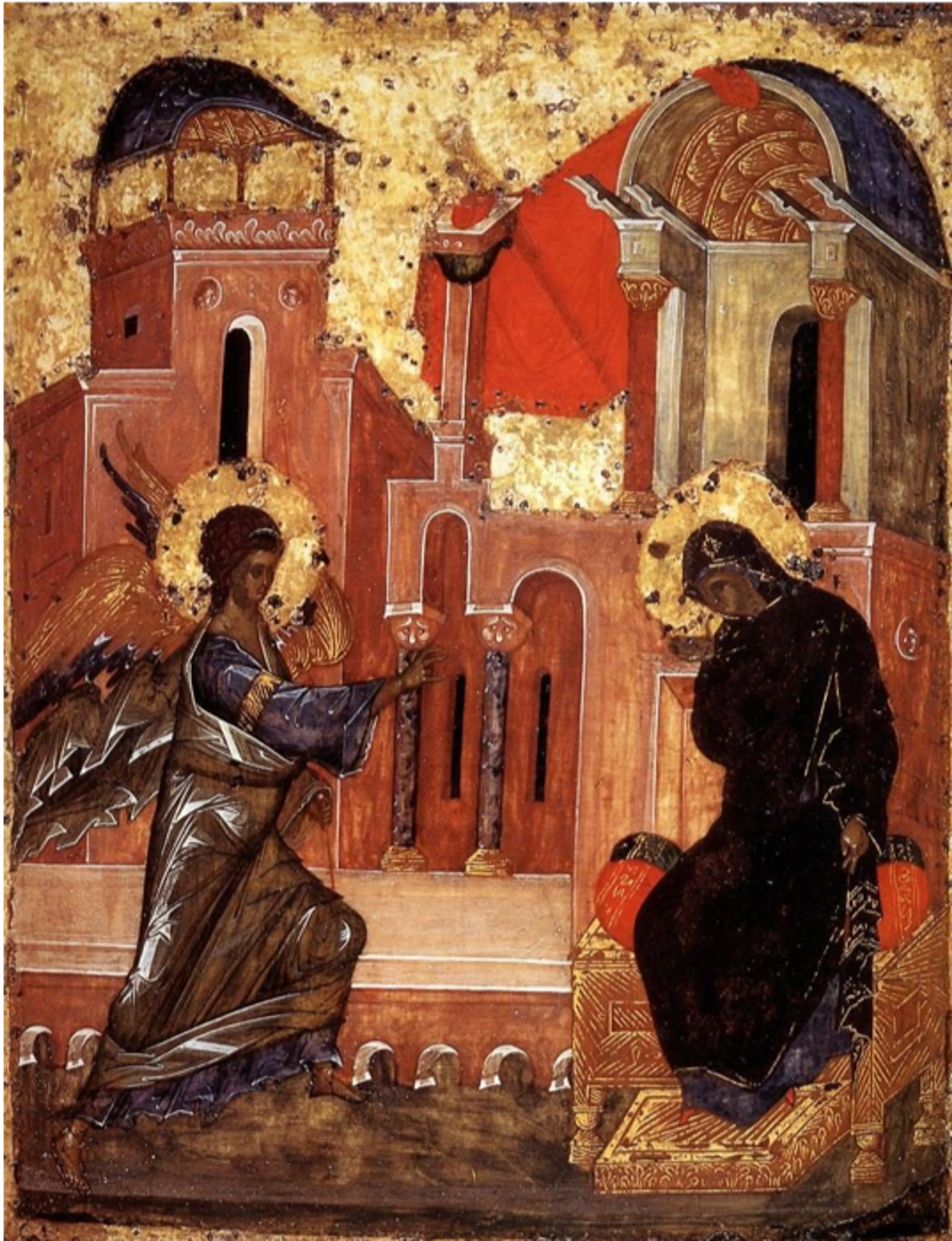 Byzantijnse iconen beelden ook hetzelfde ogenblik vanuit meerdere kanten gezien. Hieronder zie je een zogeheten Annunciatie uit de vijftiende eeuw; de engel Gabriël kondigt Maria de geboorte van Jezus aan (in het Engelse ‘announce’ hoor je hetzelfde woord terug):