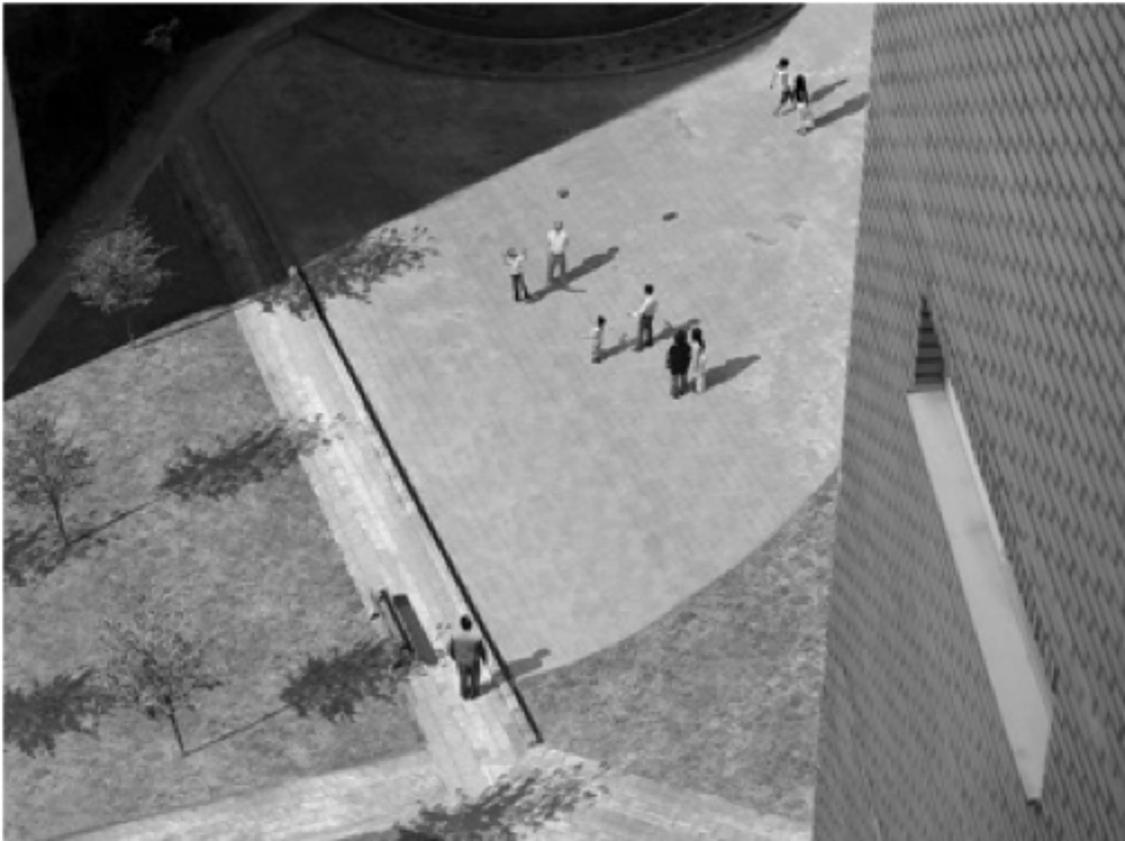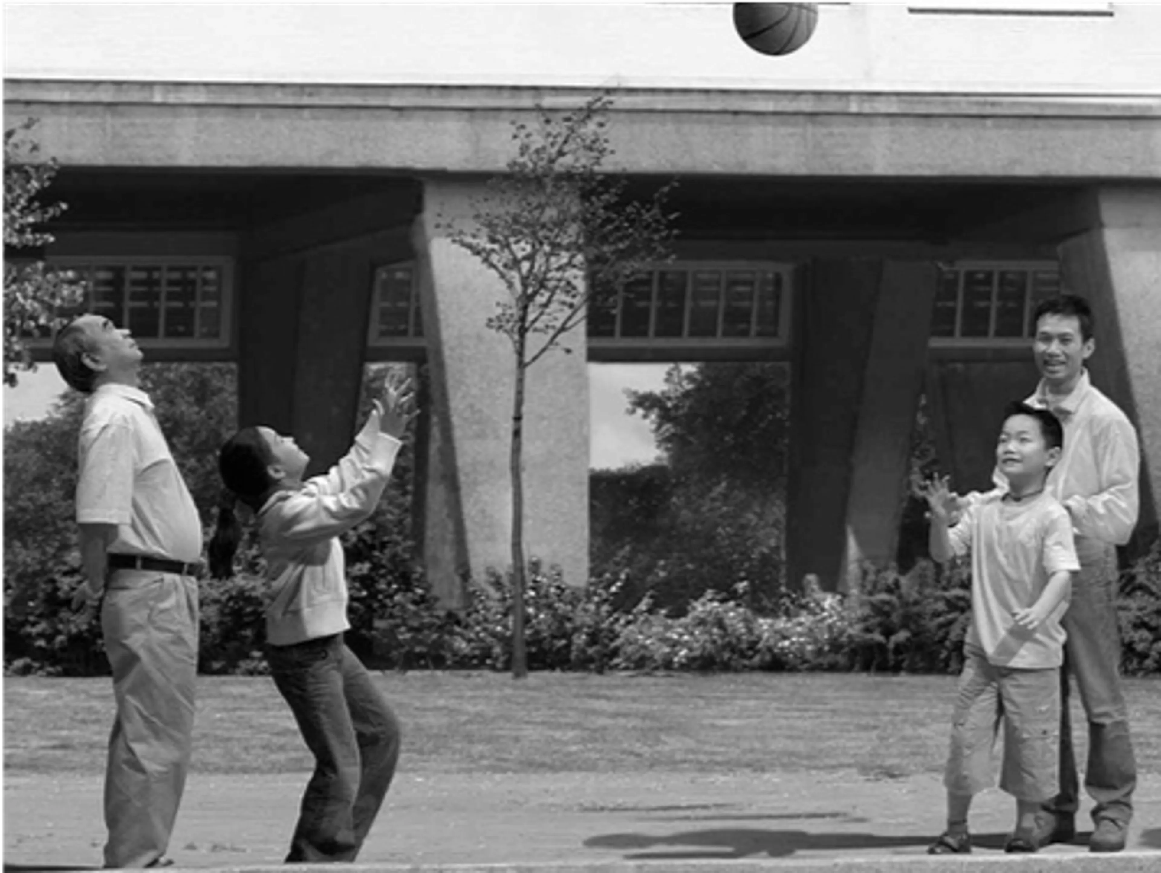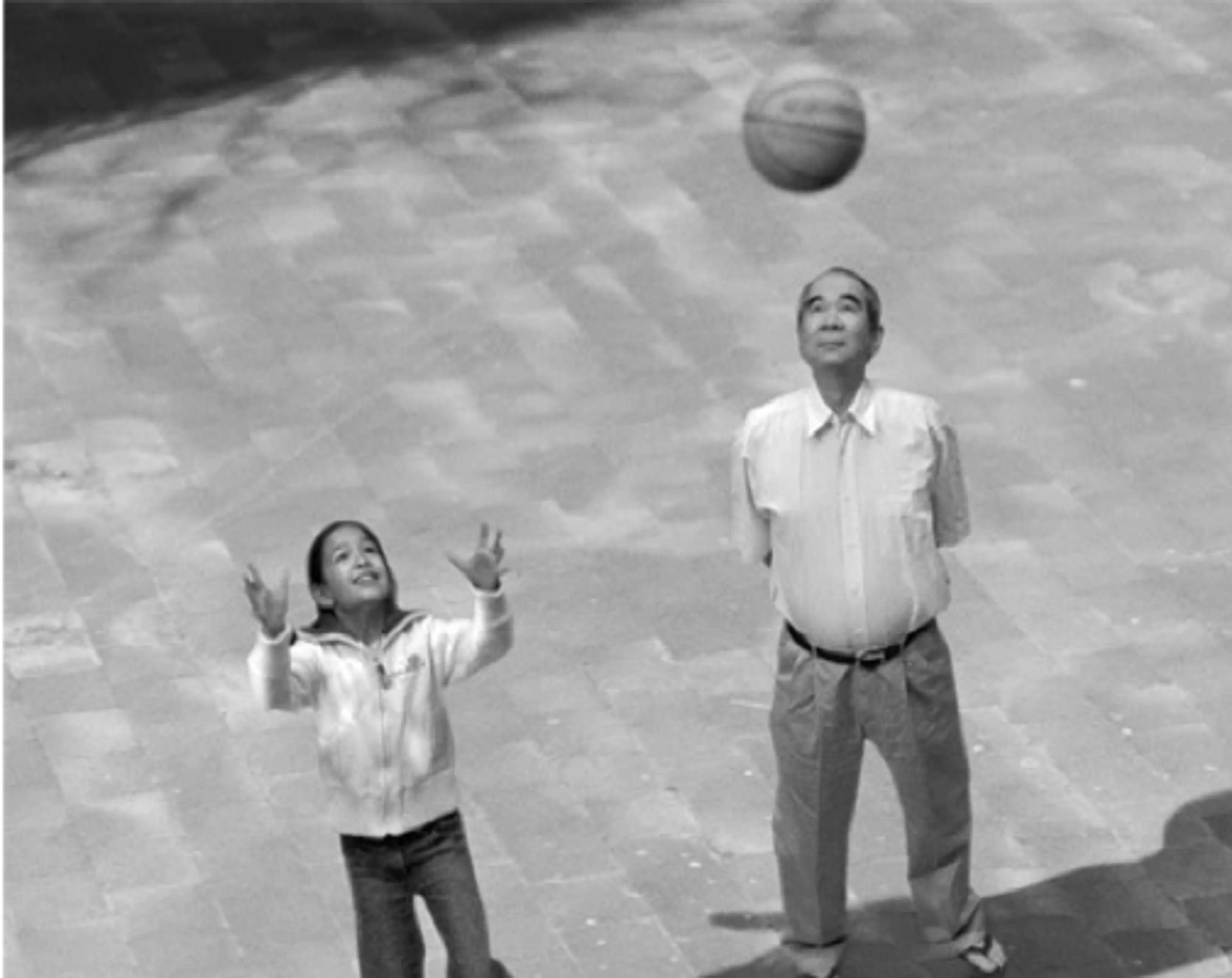 Een Aziatisch gezinnetje staat op een plein. Een kind heeft net een bal gegooid. De vader of opa kijkt ernaar. De zon schijnt helder. Dan zie je hetzelfde tafereel vanuit een andere hoek: