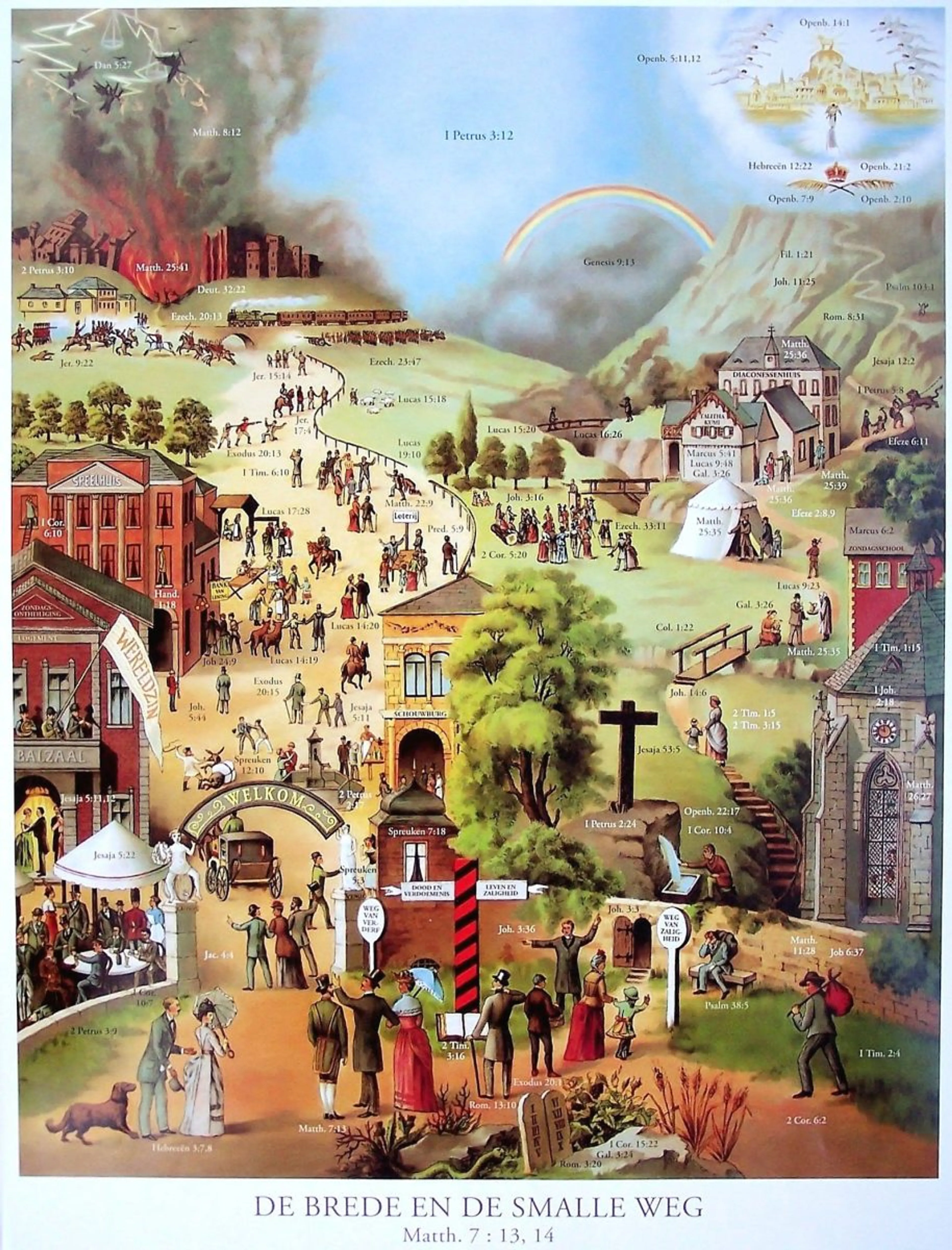 Sowieso heeft dit allemaal niets van doen met Jezus’ gelijkenis. Hij noemt wel twee wegen, maar die lopen uit op ‘het leven’ c.q. ‘de ondergang’. Nergens enige suggestie dat het om iets na de dood zou gaan, laat staan iets eeuwigs. En de betekenis van ‘smalle’ en ‘brede’ weg wordt nauwelijks nader ingevuld. In elk geval niet dat de ene plezierig of makkelijk zou zijn en de andere onprettig en zwaar. De enige invulling die Jezus noemt, is dat de smalle weg minder vindbaar is.
