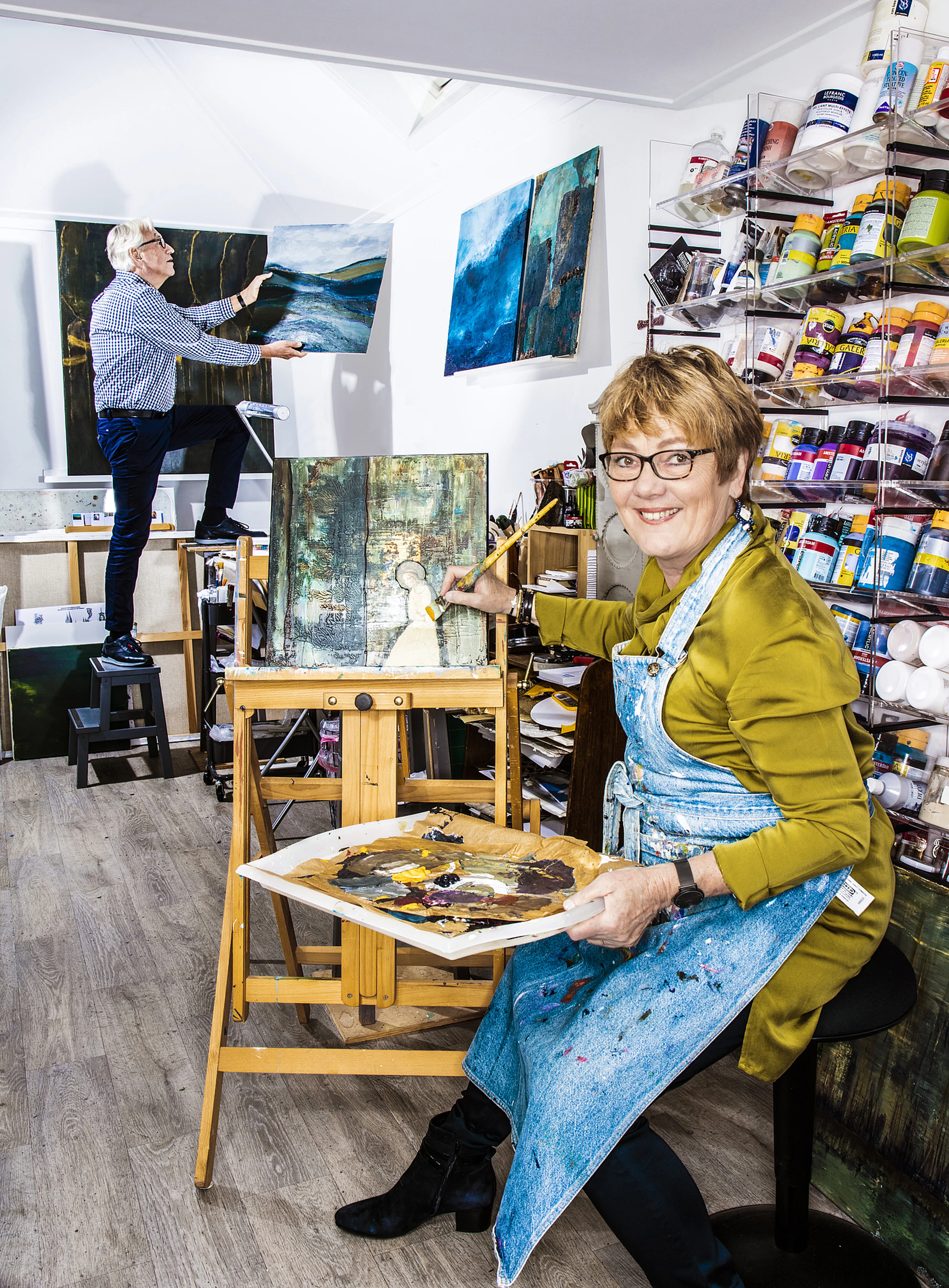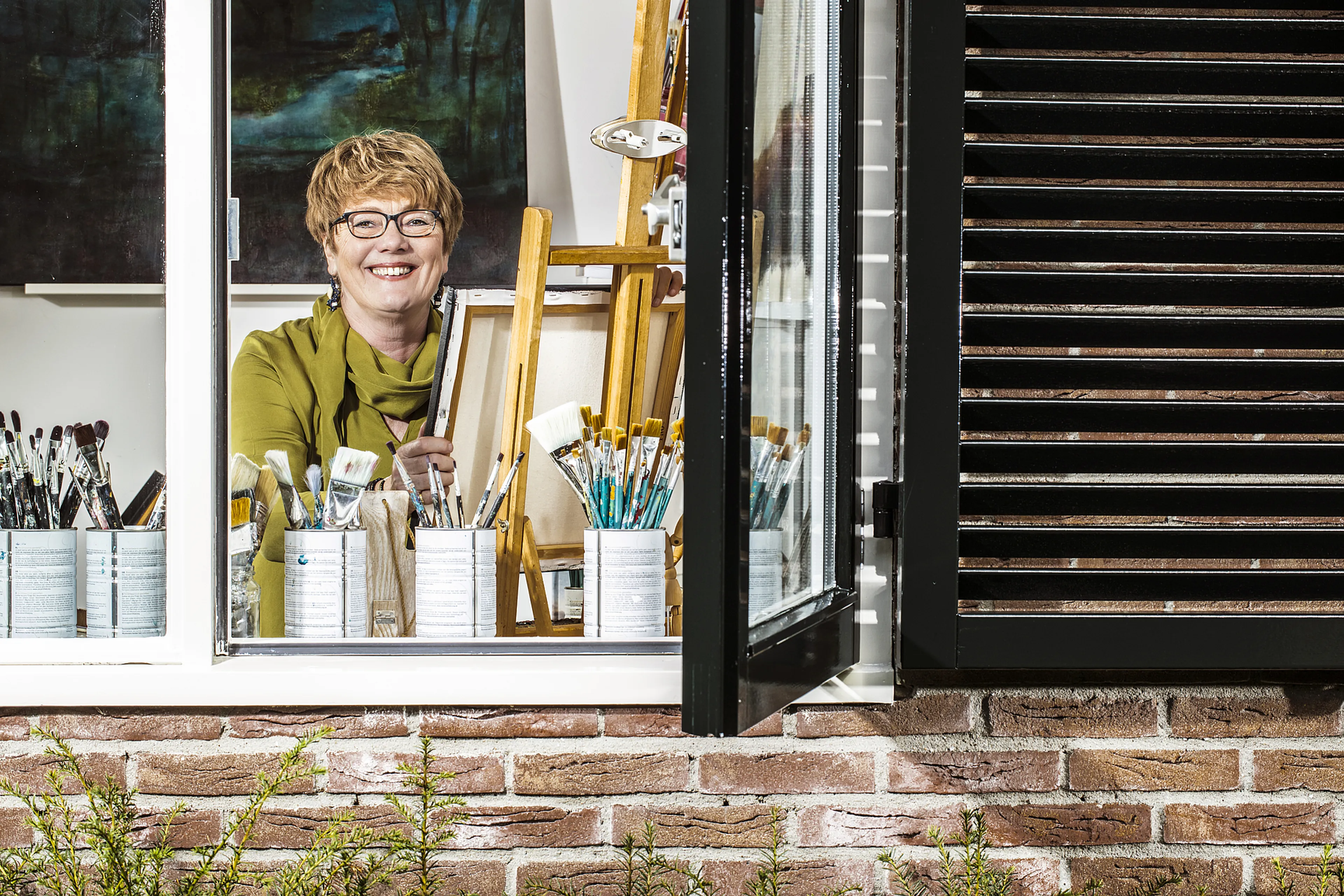 Vijf jaar wonen ze hier nu, vertelt ze in haar atelier in de omgebouwde garage in de tuin, waar háár verfgeur goed te ruiken is. Haar werken hangen aan de muren, tubes verf in alle kleuren zijn handig opgeborgen in kasten die ooit cd’s bewaarden. Ze is autodidact, maar schilderde ook veel samen met haar in 2011 overleden vriendin Christa Rosier.