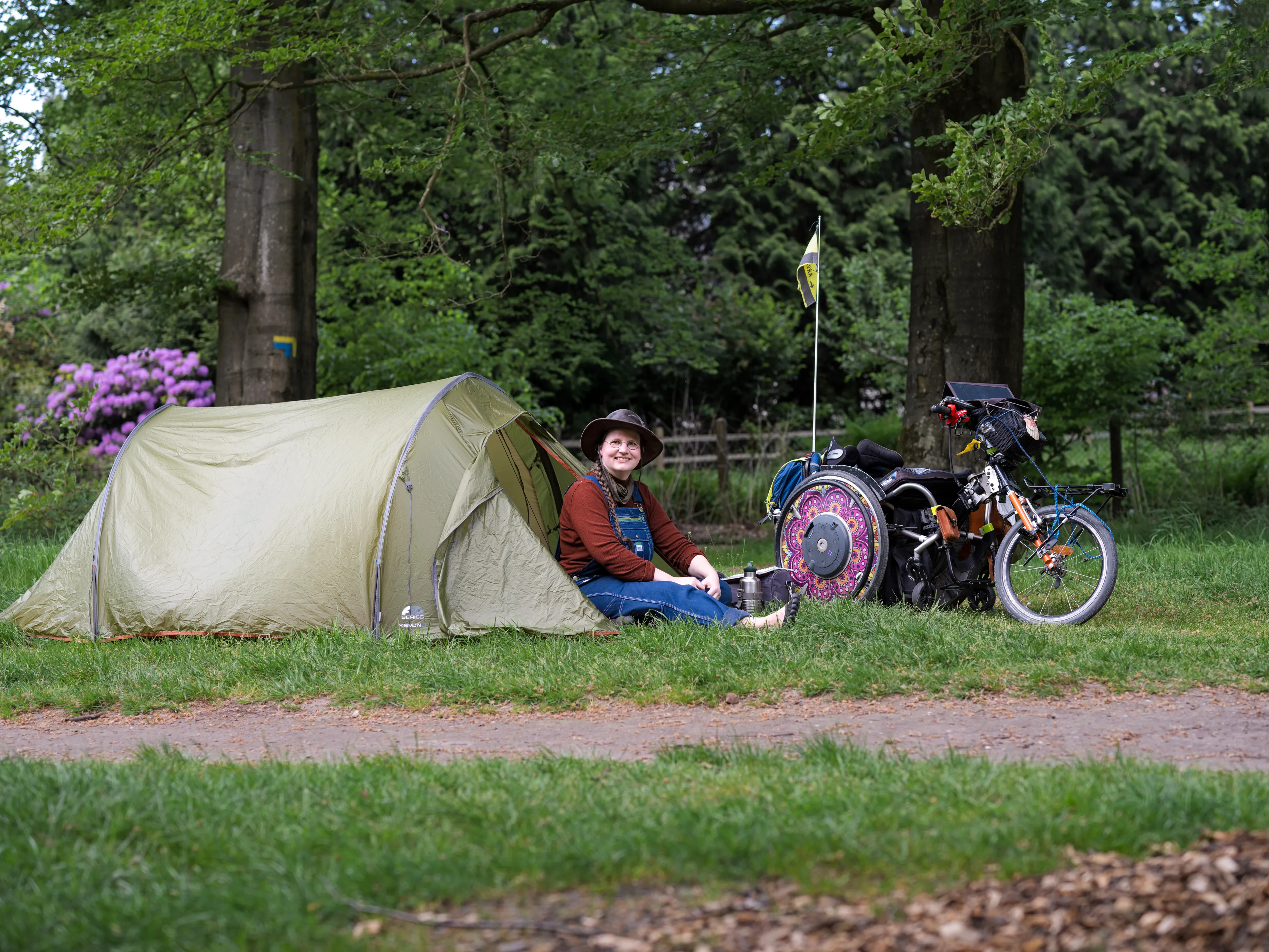 Haar rolstoel is haar alles. Het is een speciaal ding met een groot voorwiel, elektrische ondersteuning in de achterwielen en een bagagedrager voor haar tentje. Veel meer kan er trouwens ook niet mee onderweg, op een flinke voorraad medicijnen en vier extra accu’s na dan. Die batterijen klikt ze in haar wielen waardoor ze ongeveer de helft minder kracht hoeft te zetten. Gezien haar situatie geen overbodige luxe.
