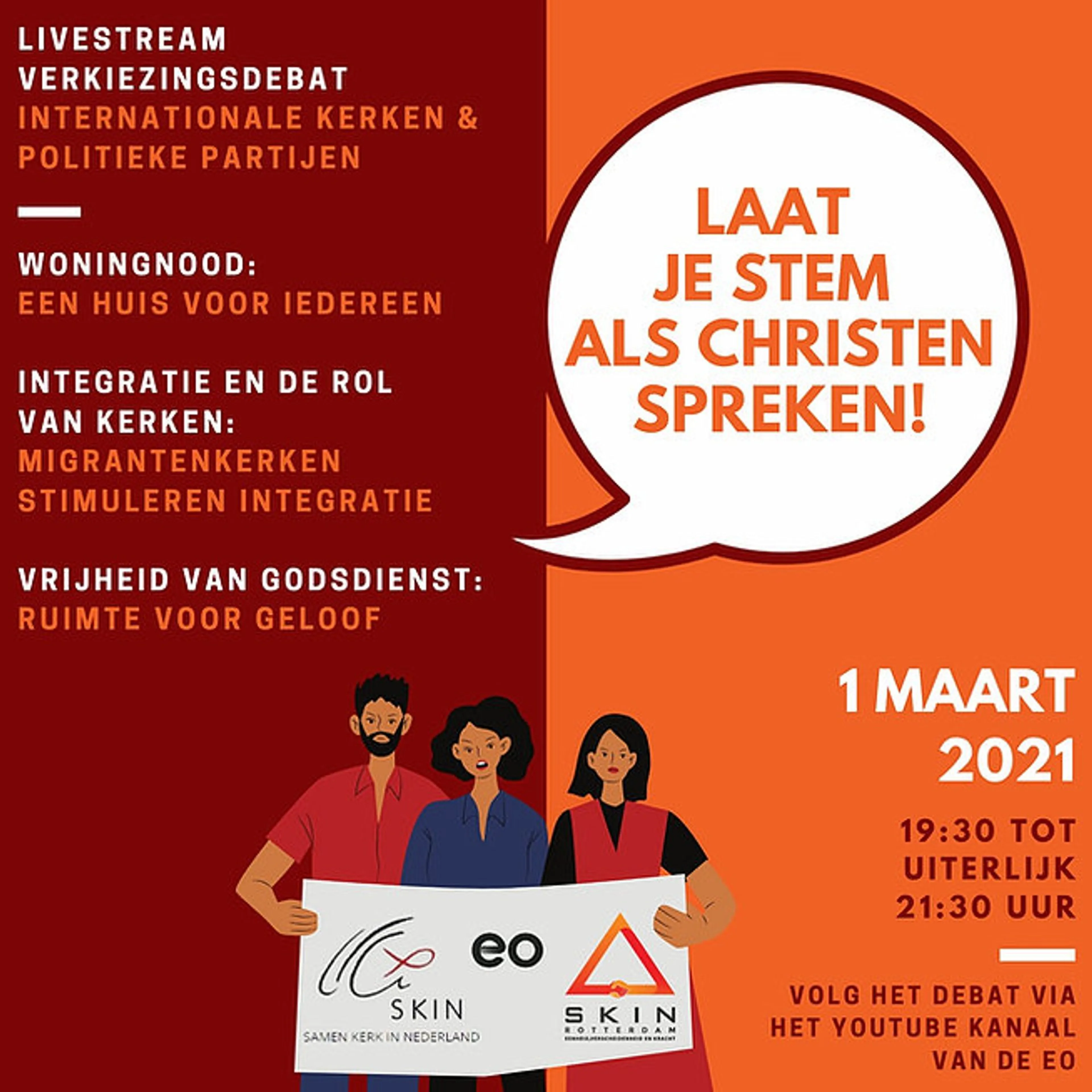 Samen Kerk in Nederland (SKIN) en SKIN-Rotterdam organiseren, in coproductie met de Evangelische Omroep, een online verkiezingsdebat op maandag 1 maart van 19.30-21.30 uur. Dit debat is te volgen via de livestream op het Youtubekanaal van de EO.