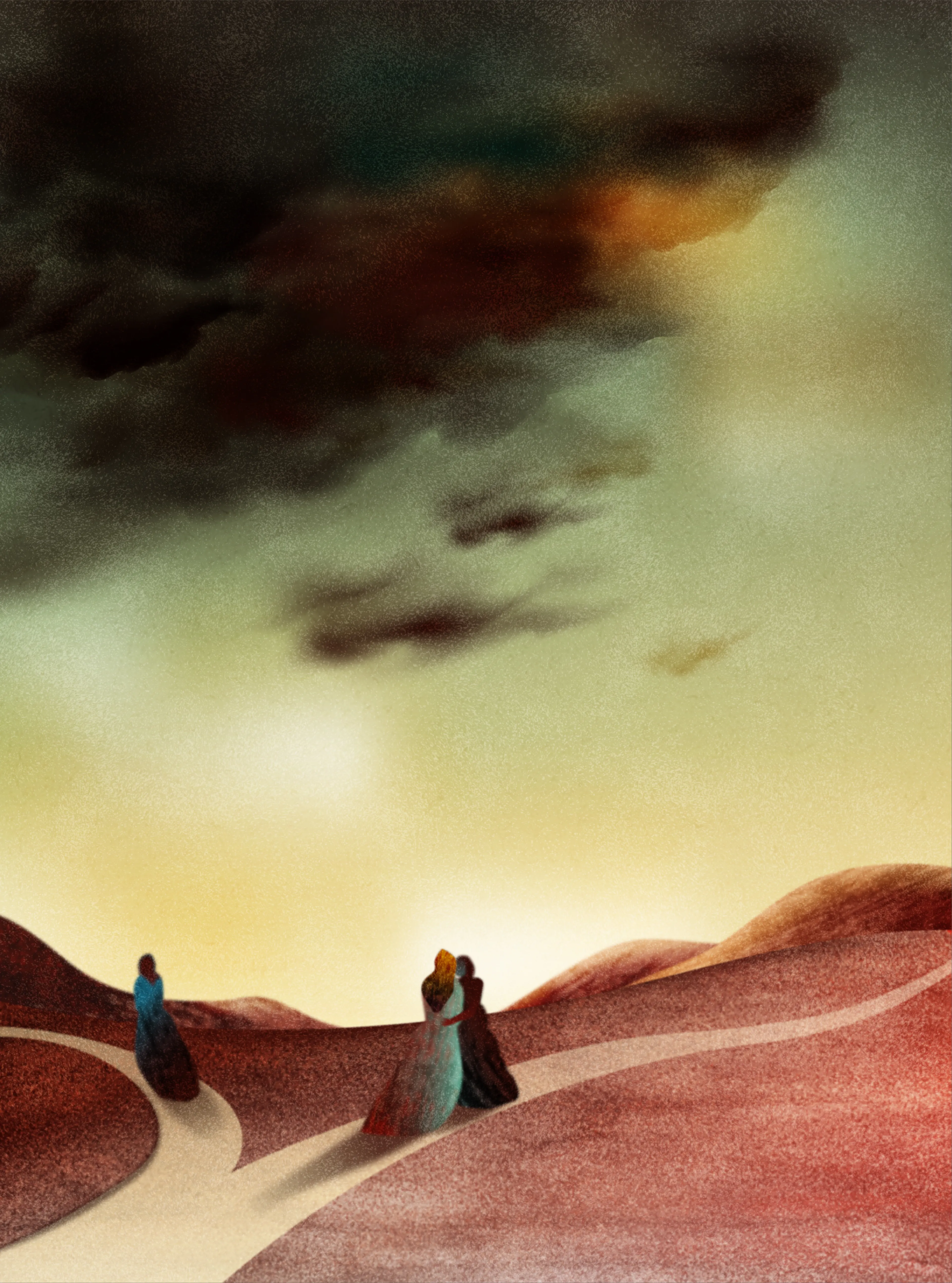 Naomi, een joodse vrouw, blijft over met Ruth en Orpa zonder mannen in Moab. Totdat ze het nieuws krijgt dat het in Bethlehem weer wat beter gaat. Alain zegt: “Naomi heeft het idee dat er geen toekomst ligt in Moab voor haar. Ze spreekt de taal misschien niet helemaal, de kans op een nieuwe partner in Moab is niet groot en ze is kwetsbaar. Een migrantenvrouw zonder familielid.” Dus ze gaat terug met het idee dat er misschien wel nog verre familie in Bethlehem woont. Lieke vult aan: “Ze is ook op leeftijd, en dat maakt haar vast ook extra kwetsbaar.” “Ja, en de kans dat er voor haar gezorgd wordt is groter in haar eigen land. Want de oudedagvoorziening die zitten hem in je kinderen en kleinkinderen in die tijd en plaats.” antwoord Alain.