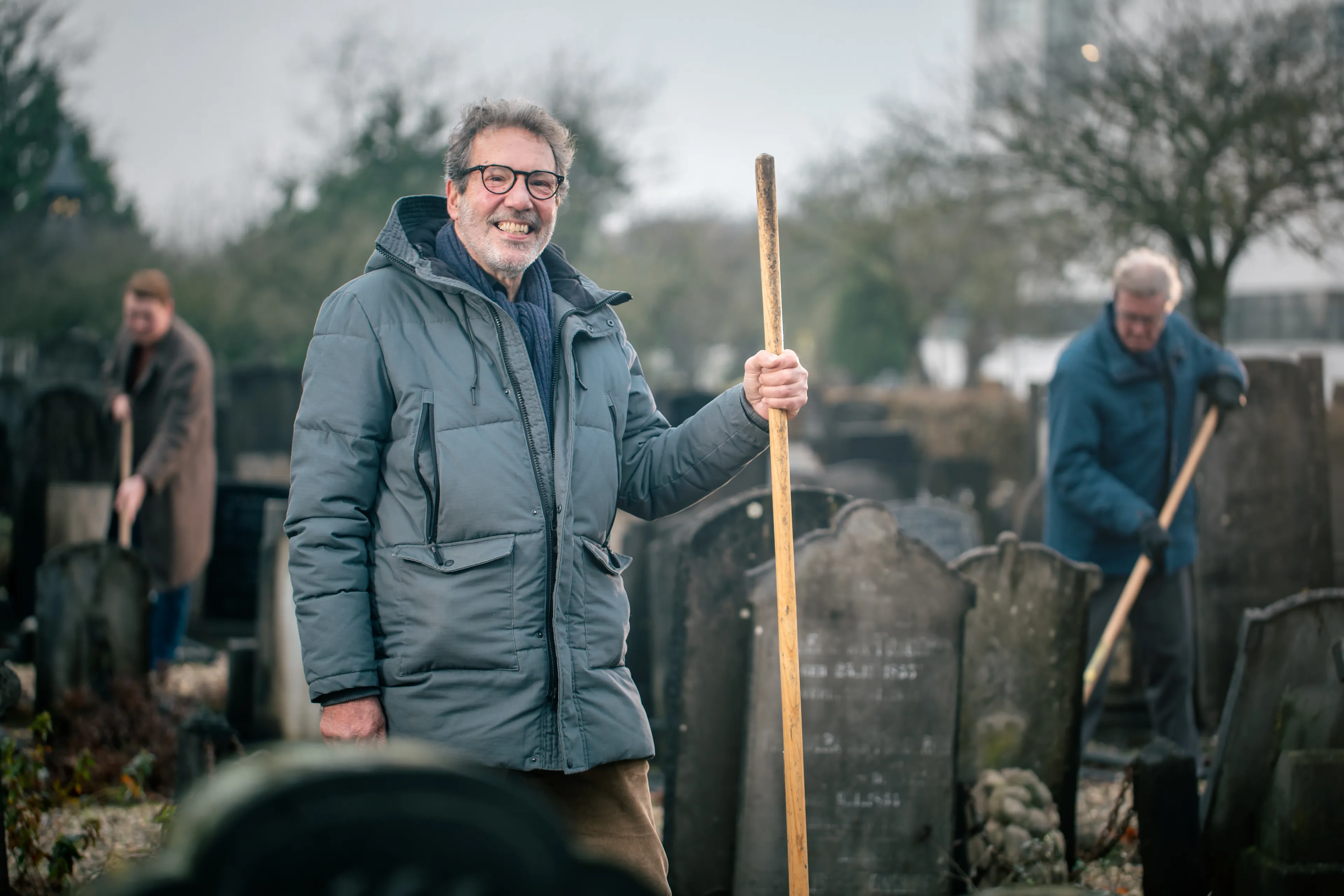Jack van Es (70) maakt wekelijks de historische begraafplaats Het Keern in Hoorn schoon, samen met onder andere Jan Lodde (77) en Tom Versluijs (19).