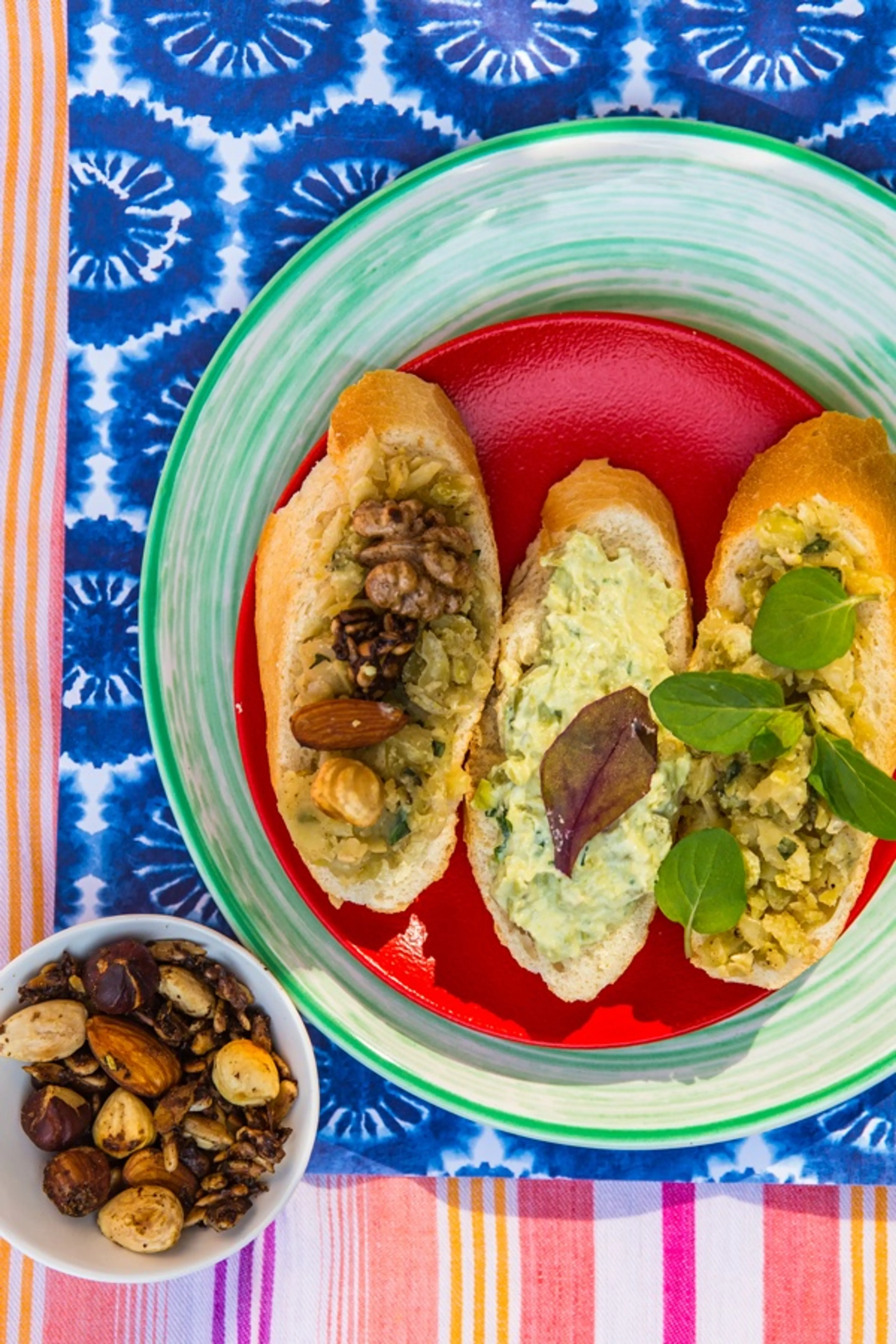 Serveer de dip op stokbrood en leg er wat zoete gegrilde noten op. Het gerecht is warm het lekkerst.