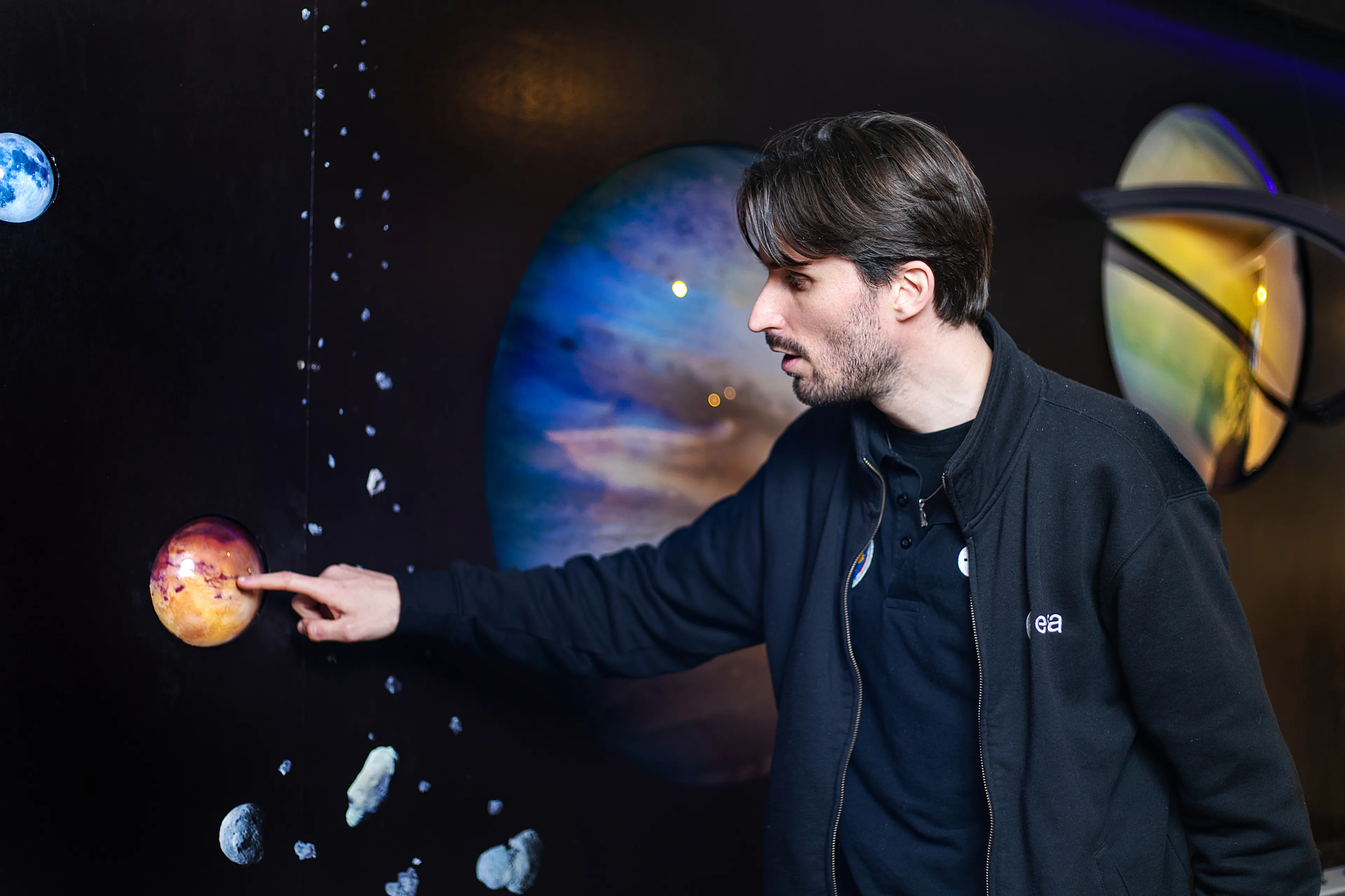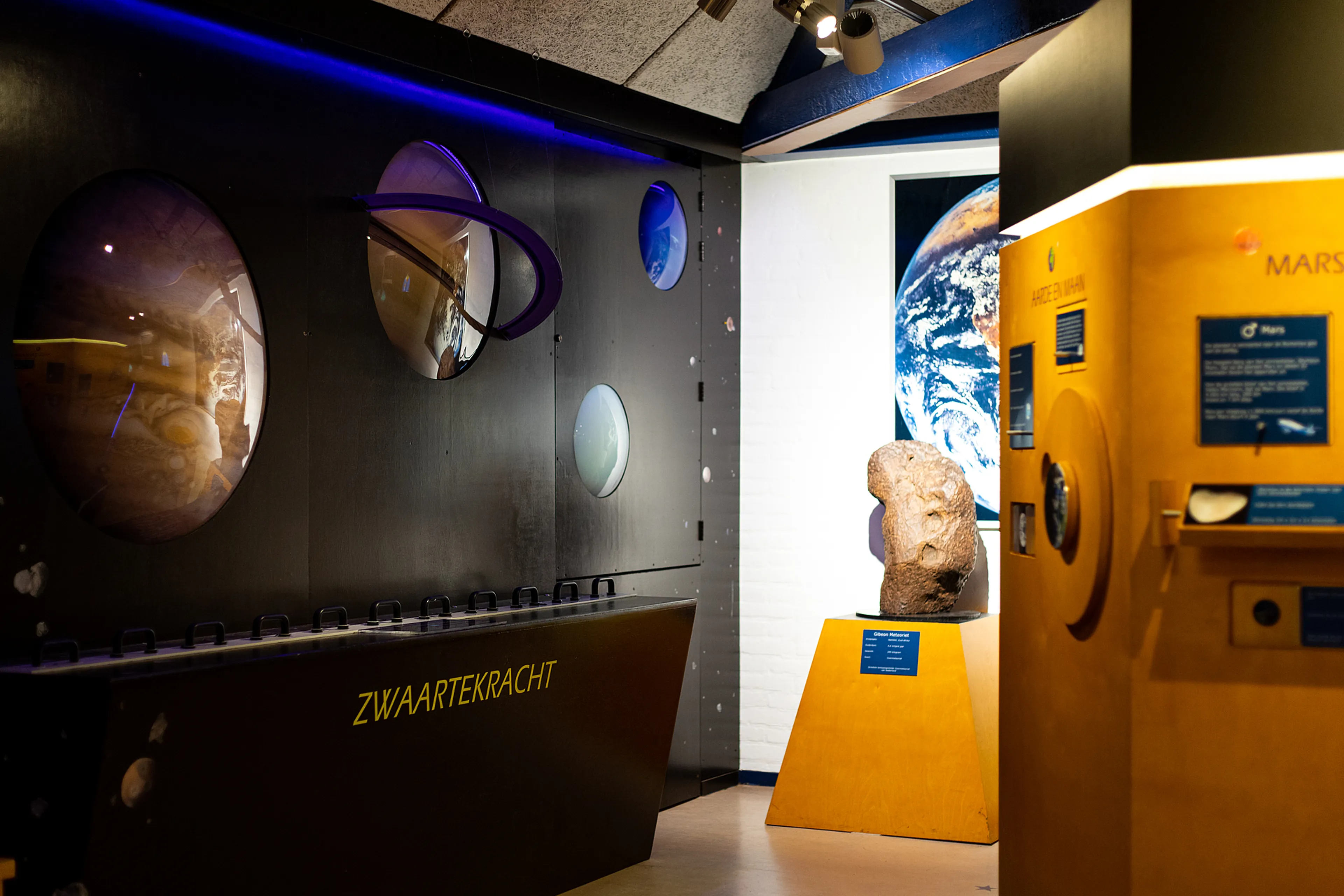 De tentoonstellingsruimte is een wondere wereld, vol met adembenemend mooie afbeeldingen van planeten, sterrenstelsels en melkwegen. Erik waarschuwt me dat hij met gemak een dag kan volpraten over alles wat er te zien is. Ik merk het; al snel buitelen de verhalen in rap tempo over me heen. Hij vertelt dat astronomie veel verder gaat dan kennis van de standen van planeten en sterren. Je kunt hier bijvoorbeeld ook zelf ervaren hoe twee kilo aardappelen weegt op de verschillende planeten door aan verschillende handvatten uit een kast te trekken. Ik probeer het uit: bij gebrek aan zwaartekracht weegt dat op Pluto en de maan helemaal niets.