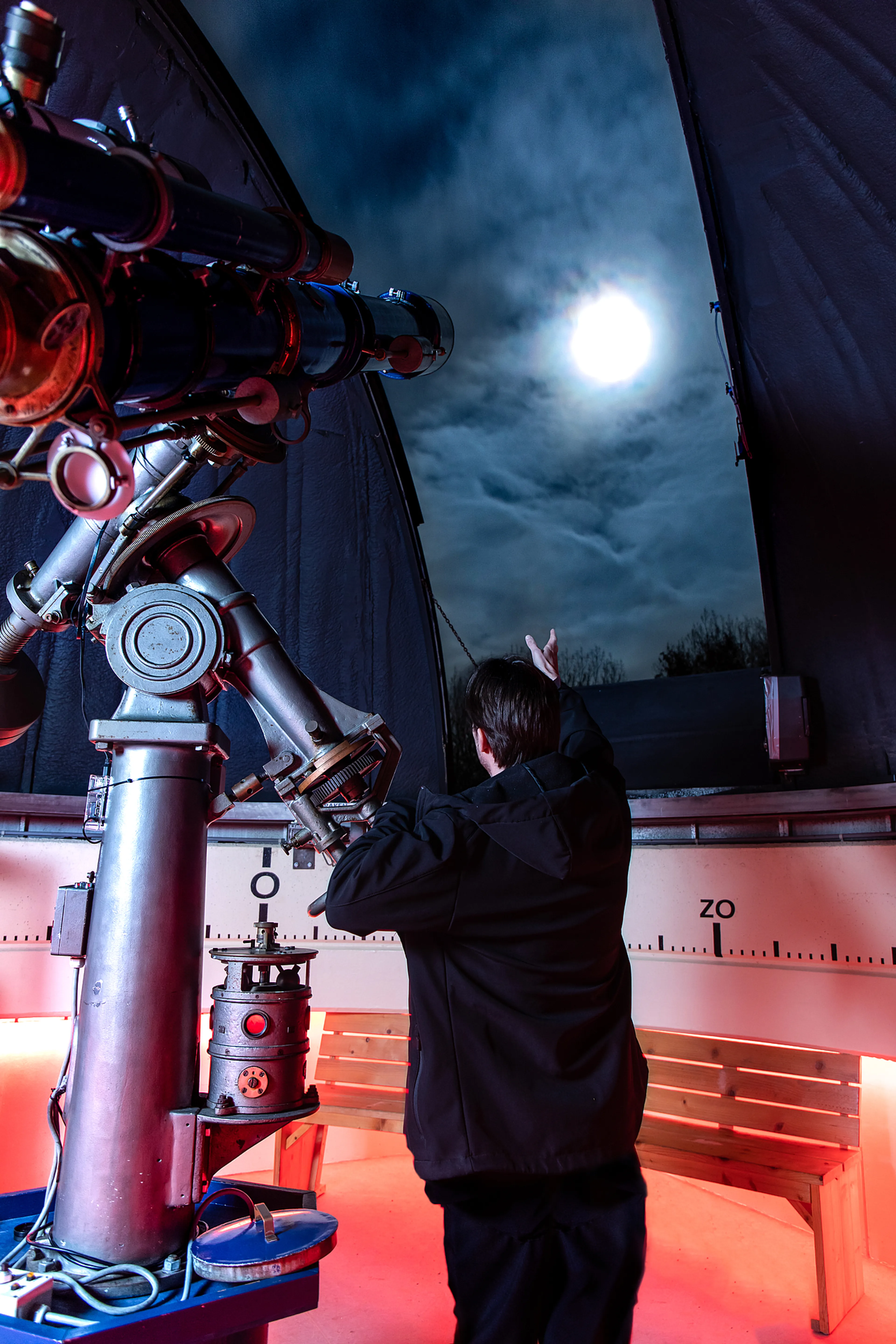 Suizebollend van alle informatie ga ik nu eindelijk de trap op naar de koepel. Erik doet wat schemerige verlichting aan en daar zie ik dan de indrukwekkende telescoop staan. Een enorm gevaarte van zo’n 1200 kilo, 100 jaar geleden met de hand gemaakt in Oost-Duitsland. “En hij functioneert nog steeds perfect,” glundert Erik. Met een druk op de knop schuift de koepel langzaam open. Het geeft een spannend sfeertje. Behendig manoeuvreert Erik de telescoop in de juiste richting. Helaas is de bewolking halsstarrig boven de Biesbosch blijven hangen. Behalve de uitbundig schijnende volle maan, krijgen we alleen Jupiter in beeld. Een felle, witte bol aan de hemel, ook met het blote oog waarneembaar. Fascinerend als je beseft hoe ver deze planeet van de aarde is verwijderd. Af en toe kruipt er een wolk voor, maar dan staat Jupiter weer te stralen.