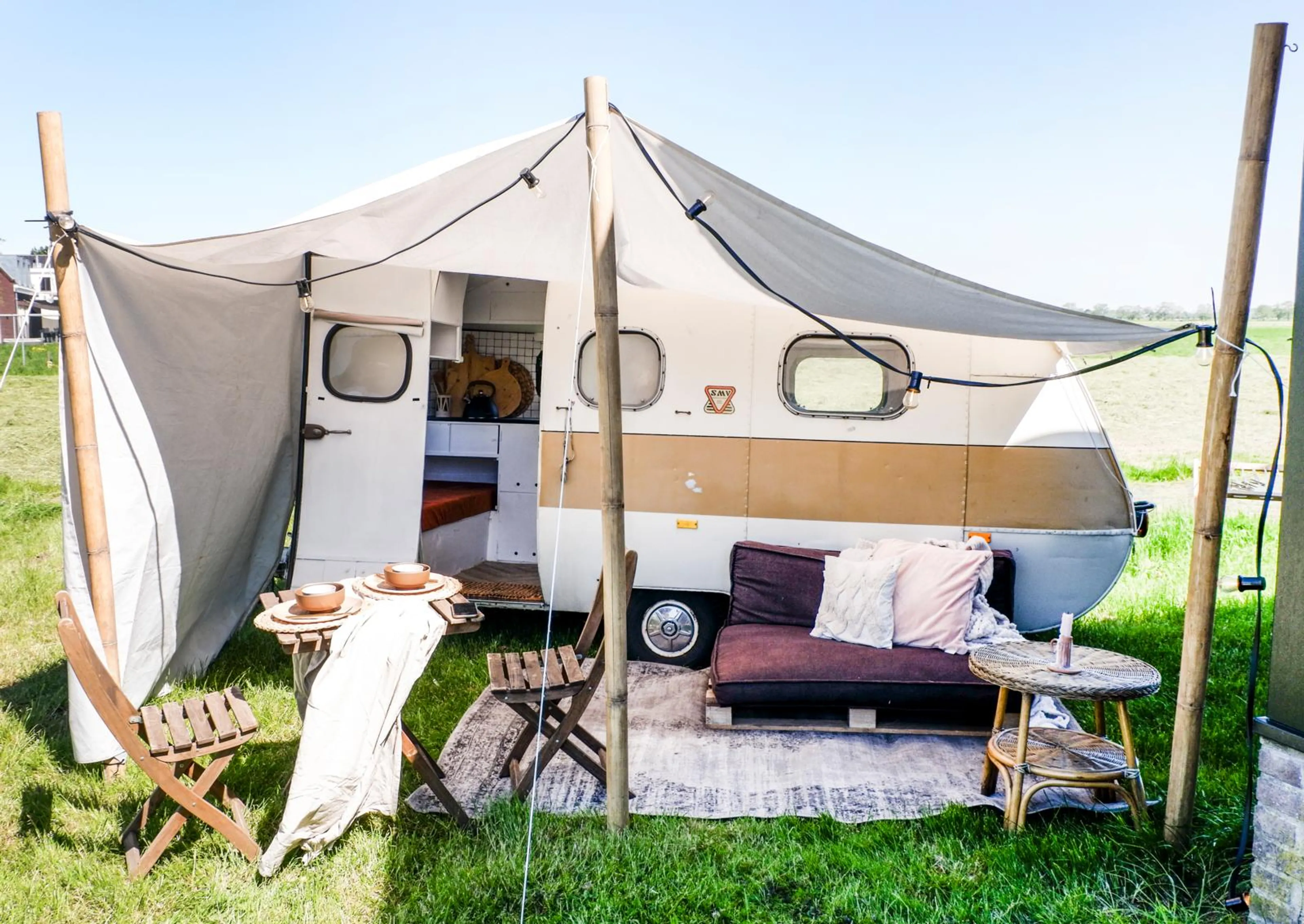 Vorig jaar kampeerde ik met mijn man, zoontje en bonuszoon voor het eerst met de caravan. In de caravan hadden we de originele luifel nog gevonden. Die had tien jaar ergens onderin gelegen, terwijl er in de caravan gespeeld werd! Er zaten geen tentstokken meer bij, maar in plaats daarvan hebben we backdrops gebruikt. Dat zijn paaltjes waarmee we voor bruiloften een prieeltje maken. Het zag er heel grappig uit, net een beachclub.