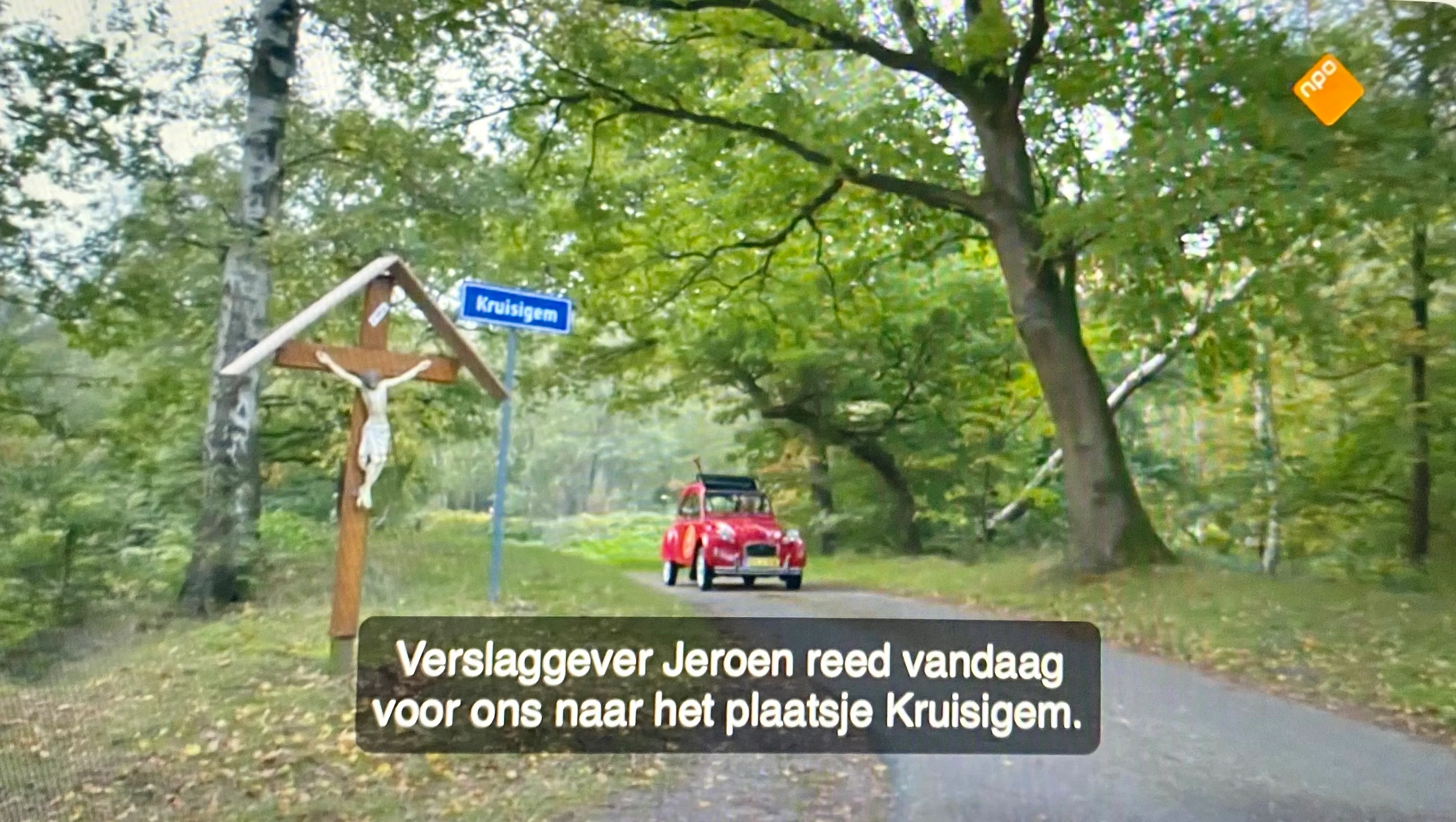 Woensdagavond liet het Sinterklaasjournaal de verslaggever zien in het fictieve plaatsje Kruisigem. Naast een aangebracht naambord stond in de berm een Christusbeeld. Op sociale media zijn verontwaardigde reacties te lezen.