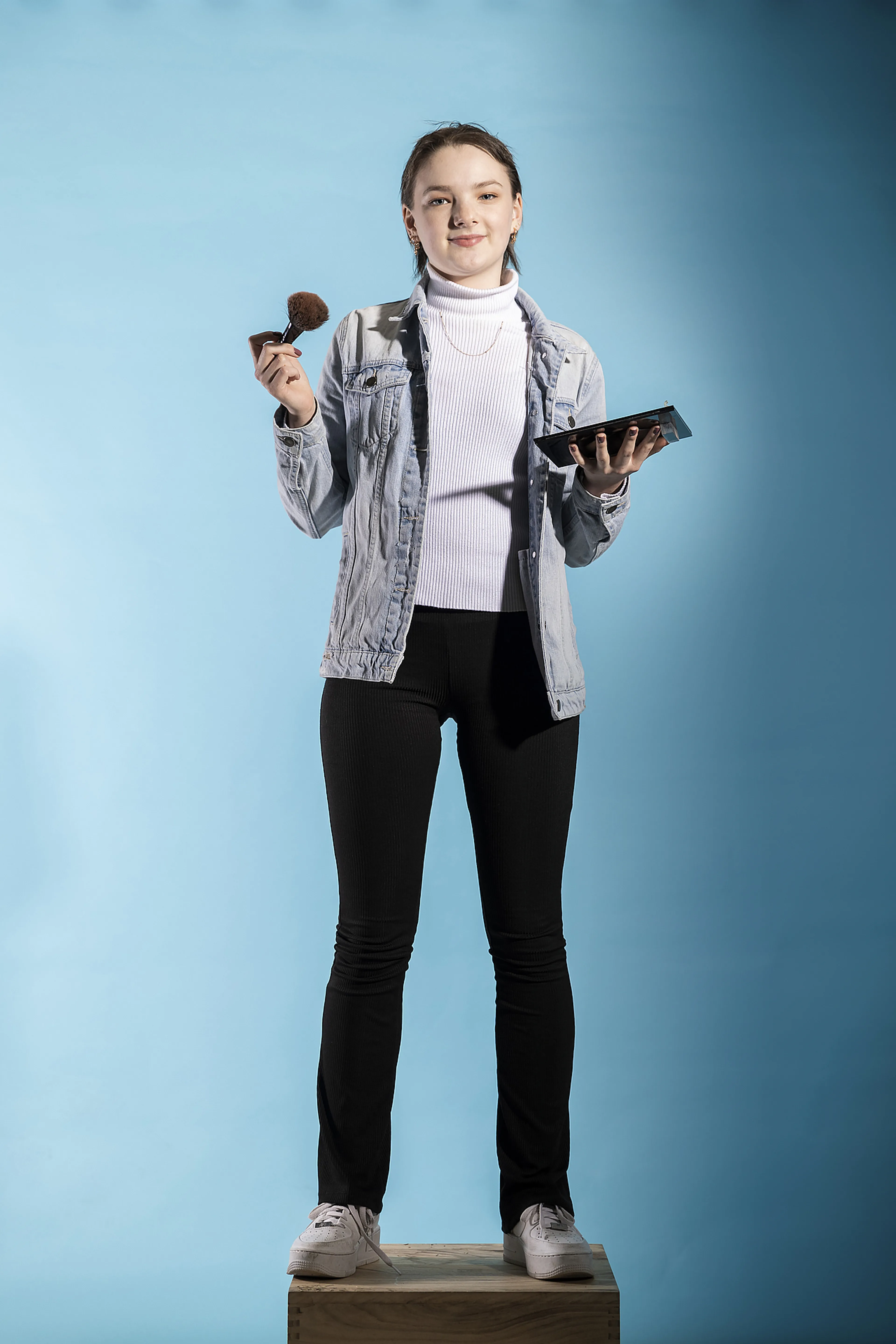 Sommige mensen dragen enorm veel make-up. Ik heb eigenlijk maar weinig op. Iedere ochtend ben ik er een kwartiertje mee bezig. Ik vind het leuk om steeds nieuwe dingen te proberen en ik kijk video’s op YouTube om inspiratie op te doen. Inmiddels heb ik een hele collectie schoonheidsproducten. M’n zussen stelen weleens wat, maar ze weten er lang niet zo veel vanaf als ik. Als ik niet opgemaakt ben, voel ik me nog steeds Danique. Maar zonder make-up naar school? Dat zal ik nooit doen.”