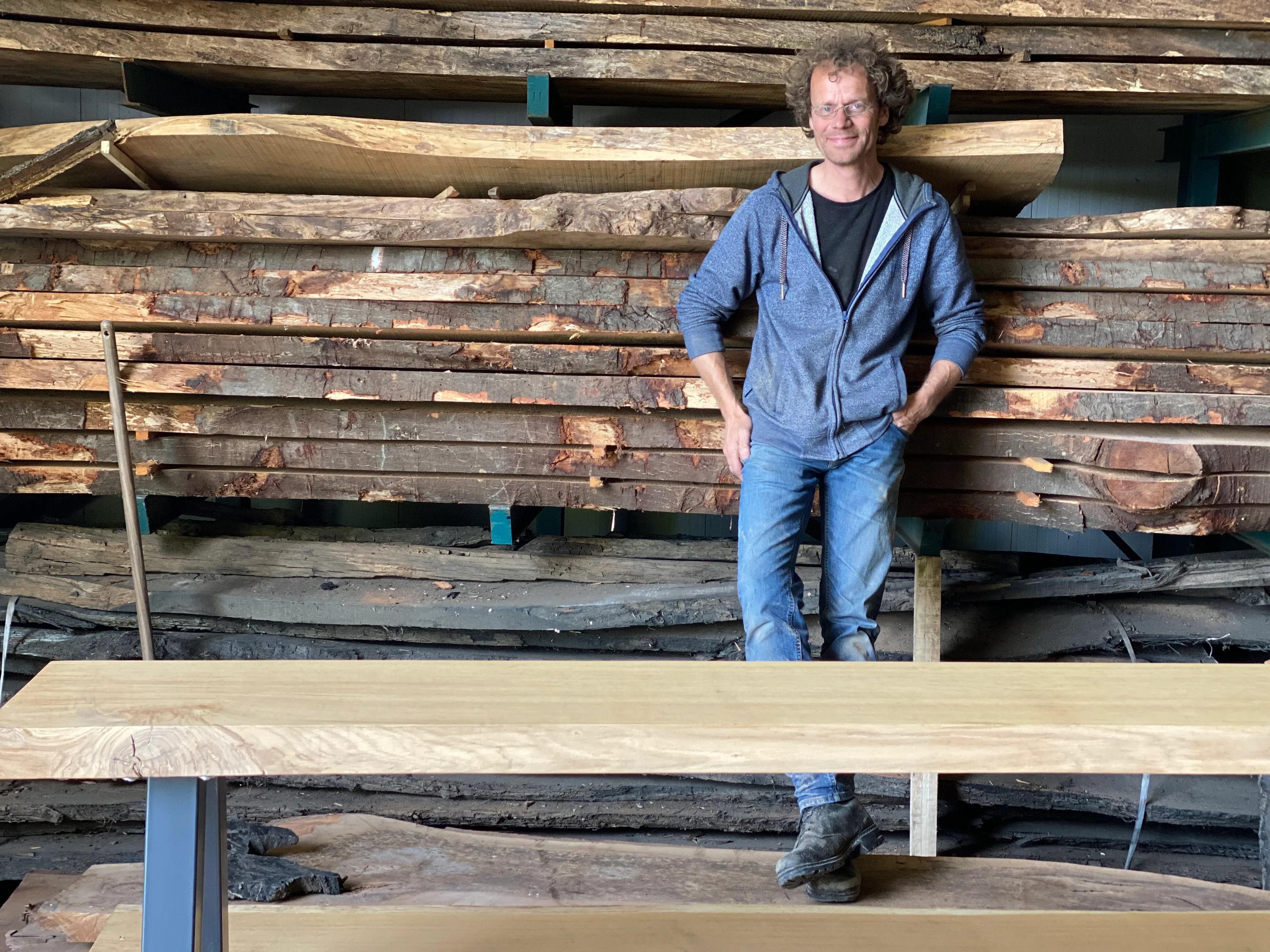 ‘Het hout vertelt het verhaal van de boom. Ik werk het liefst met hout zonder rechte lijnen. Want dat weerspiegelt het meest het echte leven: noesten en tekeningen laten de ups en downs zien van een bomenleven. Net als bij ons mensen: Soms doet het zeer en is er herstel. Zo gaat het ook bij bomen. Als een eik wat meemaakt – droogte of een afgebroken tak – dan zie je dat na jaren terug in het hout. Als ik bomen open zaag, is het soms een kadootje. Zo’n mooie tekening in het hout geeft wat prijs over het leven dat de boom heeft gehad. Dat vind ik prachtig. Daar geniet ik van.’
