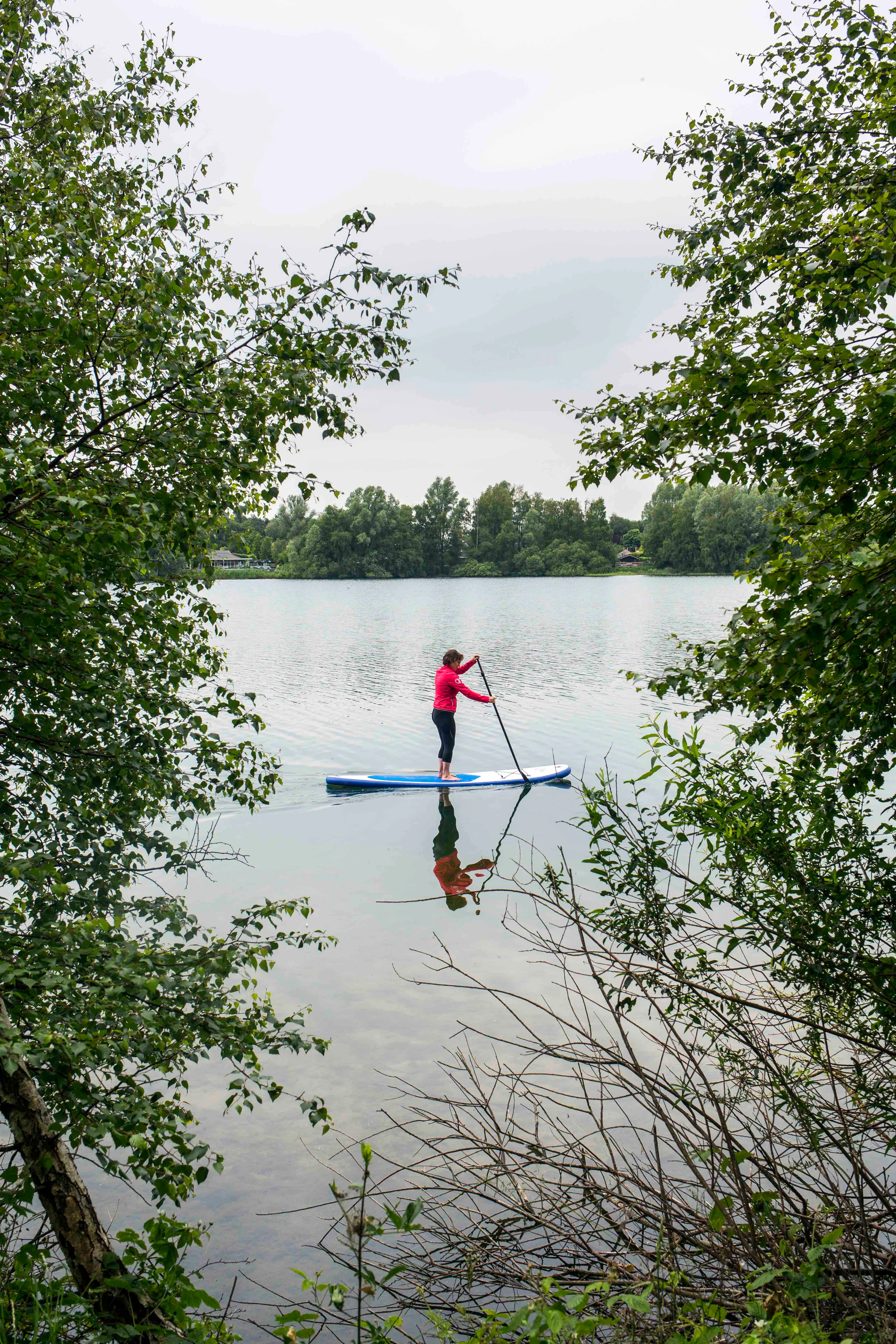 Eerlijk is eerlijk: ik vond het suppen ontzettend leuk, maar ik ben doodop als ik thuiskom. “Ik zou best even een dutje willen doen,” app ik naar mijn collega’s. Maar niks ervan, er moet nog een artikel geschreven worden. Een paar dagen later begint het weer te kriebelen. Ik neem zelfs een kijkje bij de plaatselijke sportzaak om te zien wat een supboard kost. Eerst nog maar eens huren, besluit ik, en op een ochtend rijd ik samen met de fotograaf naar Bussloo. Bij een van de kiosken staat het board al voor me klaar en ga ik opnieuw het water op. Dit board is wat kleiner en een stuk instabieler, waardoor ik er de eerste paar minuten wat verkrampt op sta. Ik herinner me weer wat Marnix zei: “Het ene board is het andere niet. De kwaliteit bepaalt het gemak waarmee je supt.” Maar als ik begin te peddelen, heb ik al snel de smaak weer te pakken. Wauw, dit is echt leuk!