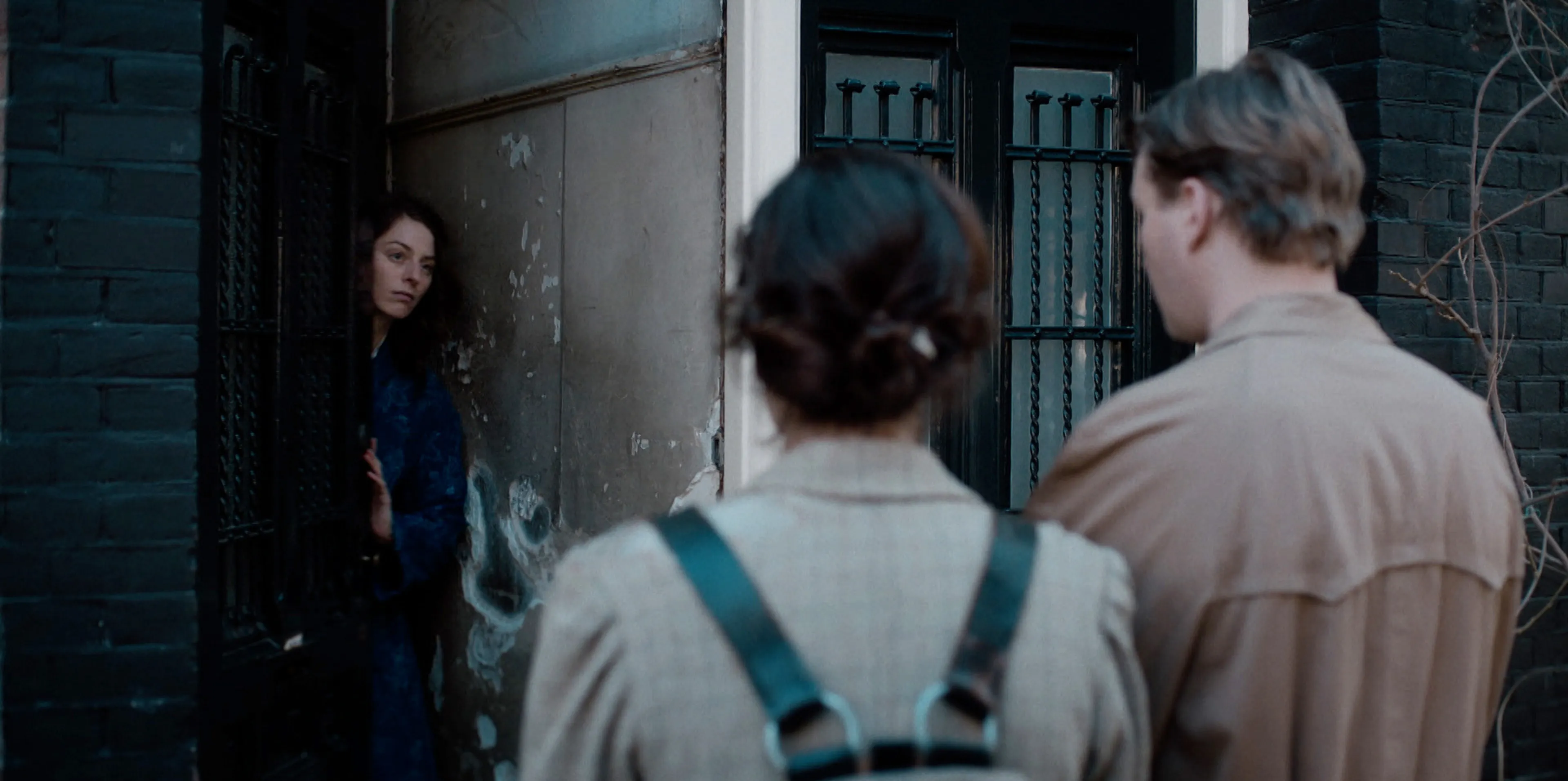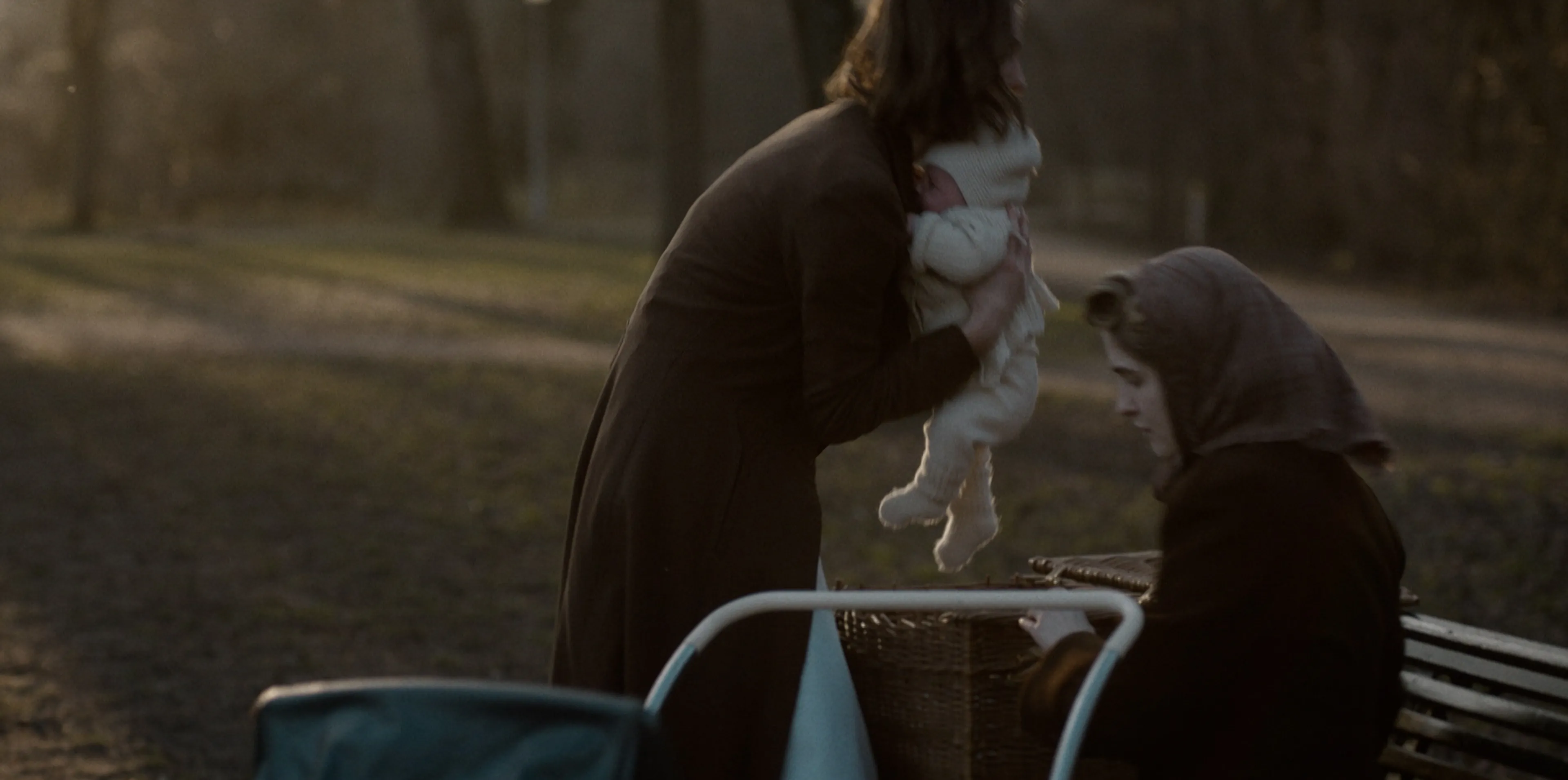 De scene uit aflevering 4 waarin Virrie een Joodse baby in een rieten mand uit het ziekenhuis smokkelt. In het Oosterpark staat een vrouw te wachten op de baby. Zij brengt de baby in veiligheid.