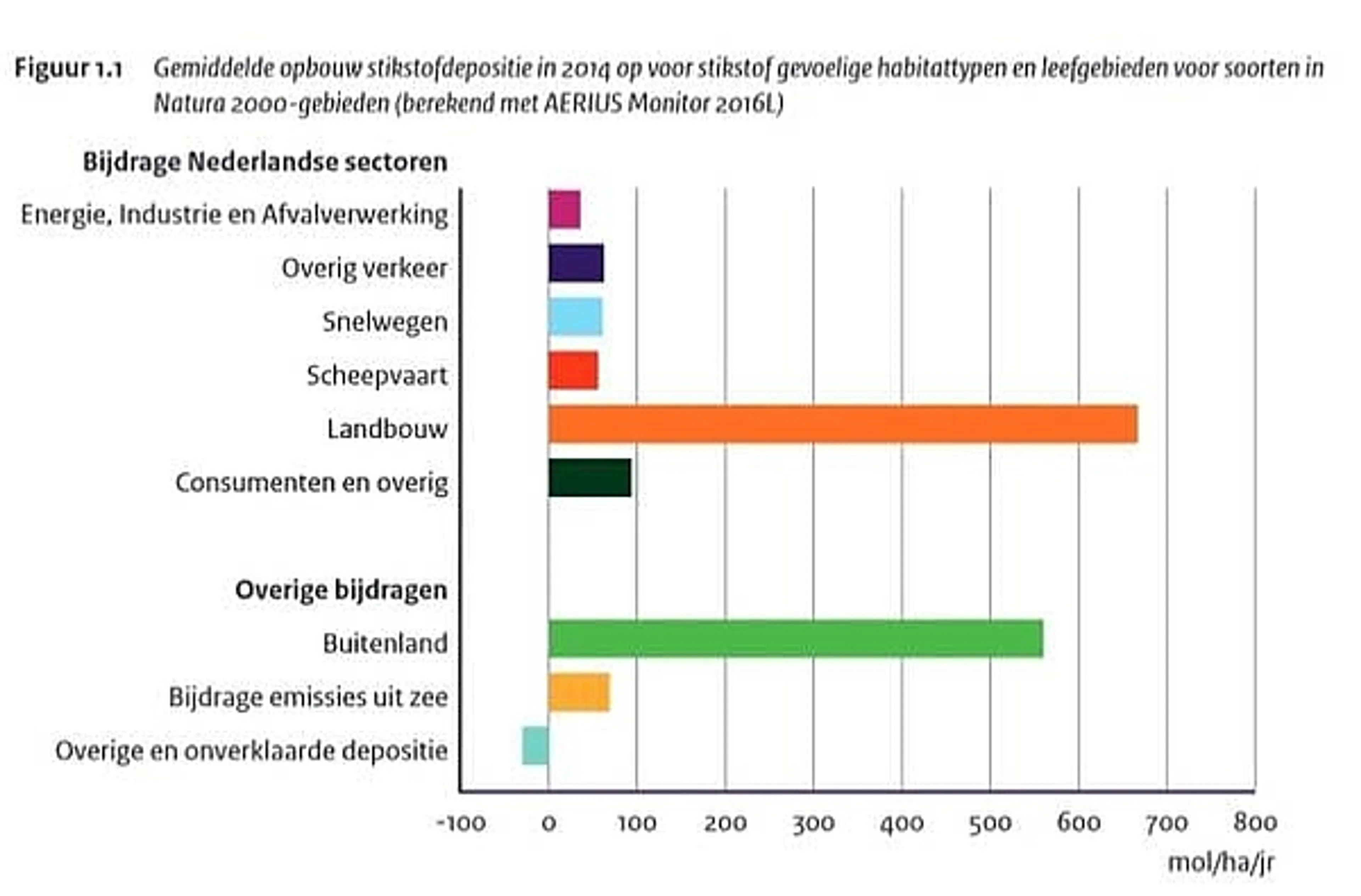 31% komt uit het nabije buitenland (zoals België en Duitsland), huishoudens ruim 6%, wegverkeer ruim 6%, industrie/scheepvaart/luchtvaart 11% en landbouw 45%. (landelijke en openbare cijfers van het RIVM, zie de taartdiagram). Er is door de rijksoverheid ook gekeken naar de herkomst van stikstof in onze meest bijzondere natuurgebieden: Natura 2000. Daaruit blijkt dat landbouw de grootste bron van stikstof (ammoniak) is, zie de staafdiagram. Landbouw, of liever gezegd intensieve veeteelt is dus de grootste post en let op: onze stikstofexport is veel groter dan onze import. Mopperen op de buren mag pas als we onze eigen uitstoot flink hebben teruggebracht. Kijken we alleen naar onze eigen uitstoot, dan is 65% van onze uitstoot afkomstig uit de landbouw/veeteelt, daarom is de meeste winst daar te halen. Maar ook andere bedrijfstakken zullen aan de bak moeten.
