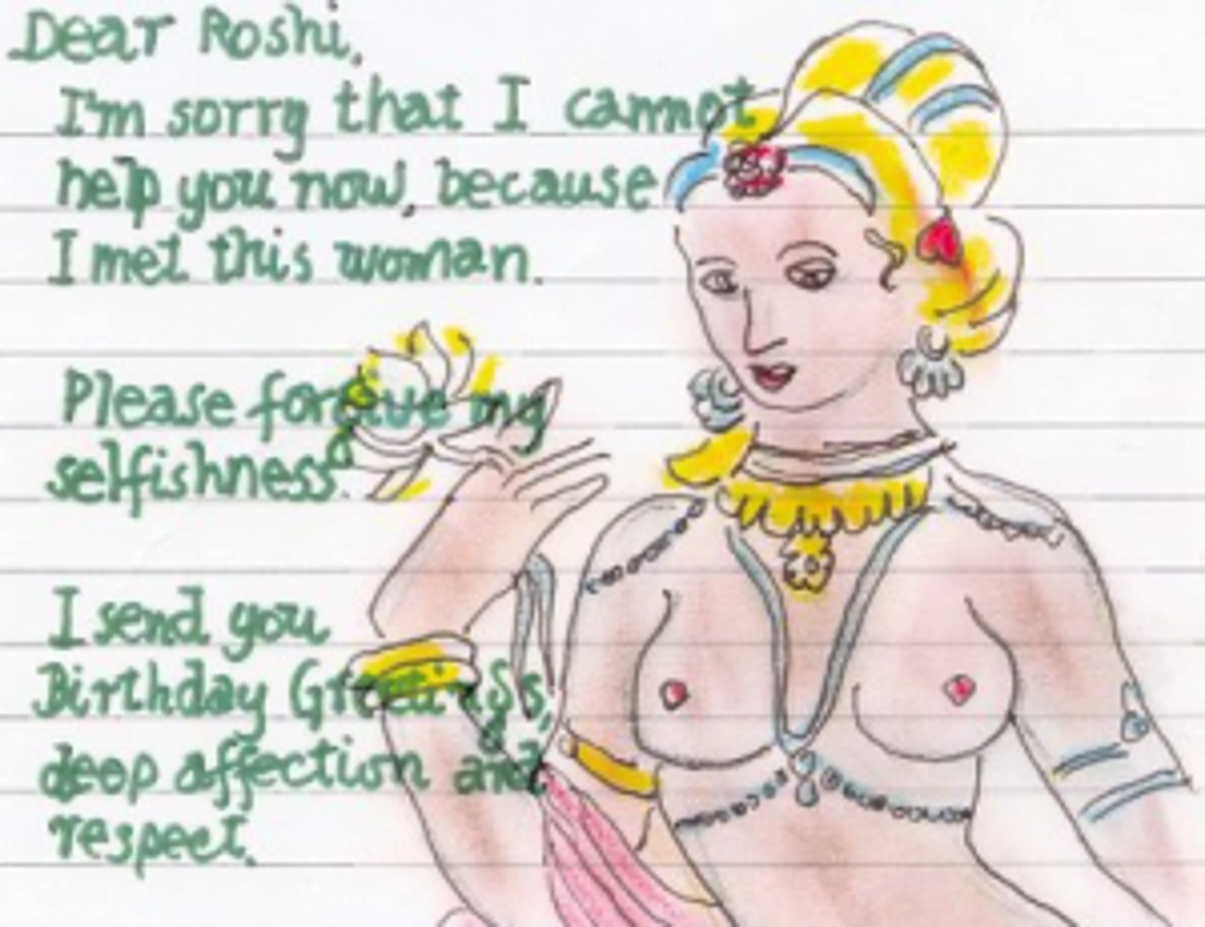 Tussen 1996 en 1999 leefde Cohen op een berg als Roshi’s monnik, chauffeur en huisgenoot. Samen dronken ze tegen de regels in sterke drank en filosofeerden ze over het leven, steeds minder in een gezagsverhouding en meer als vrienden. In de gedichten en tekeningen die Leonard in die tijd heeft gemaakt speelt de meester ook een grote rol. Zoals hier (bron):