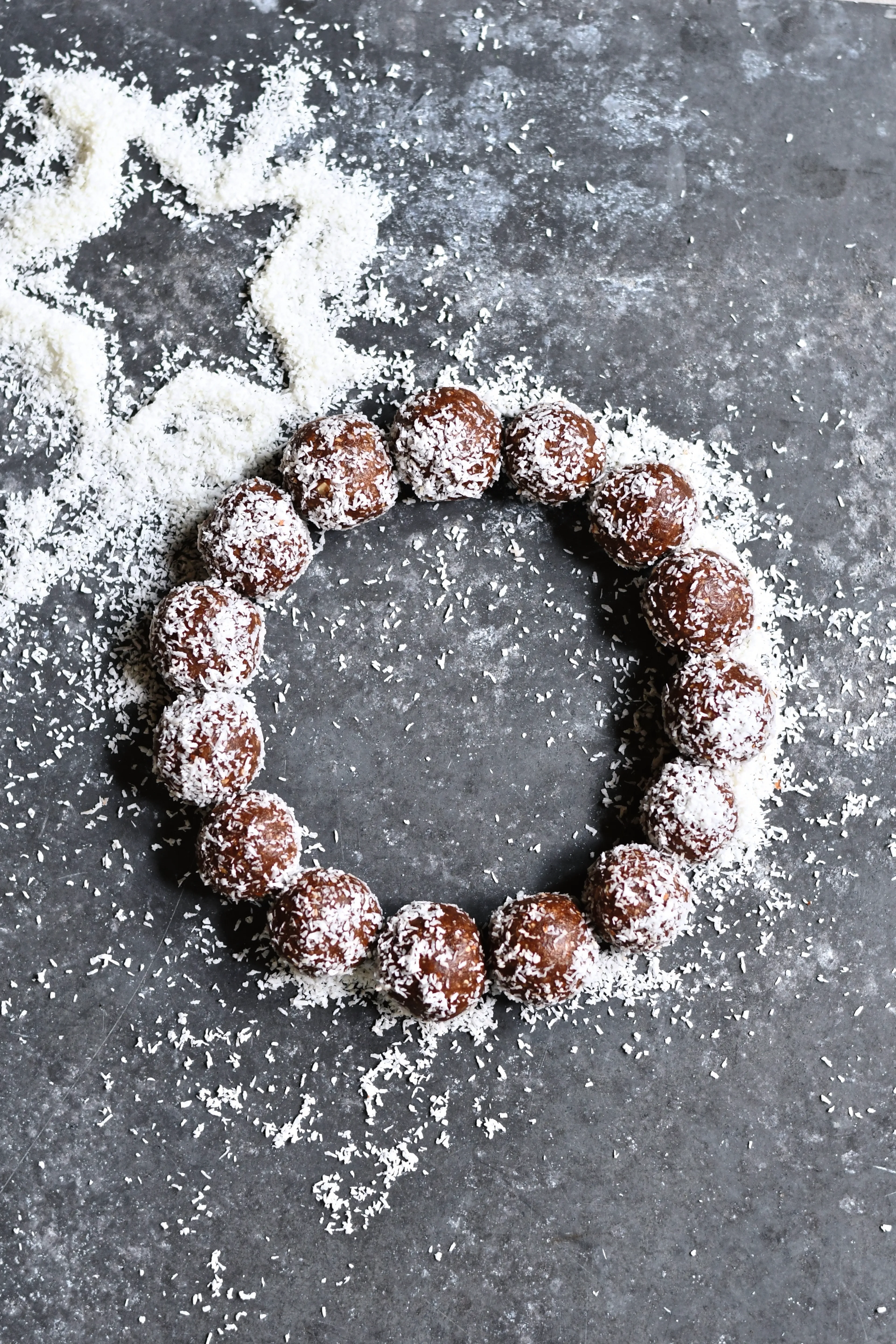 2. Rol van het deeg zestien balletjes. Rol de balletjes door het geraspte kokos. Bewaar afgedekt in de ijskast.