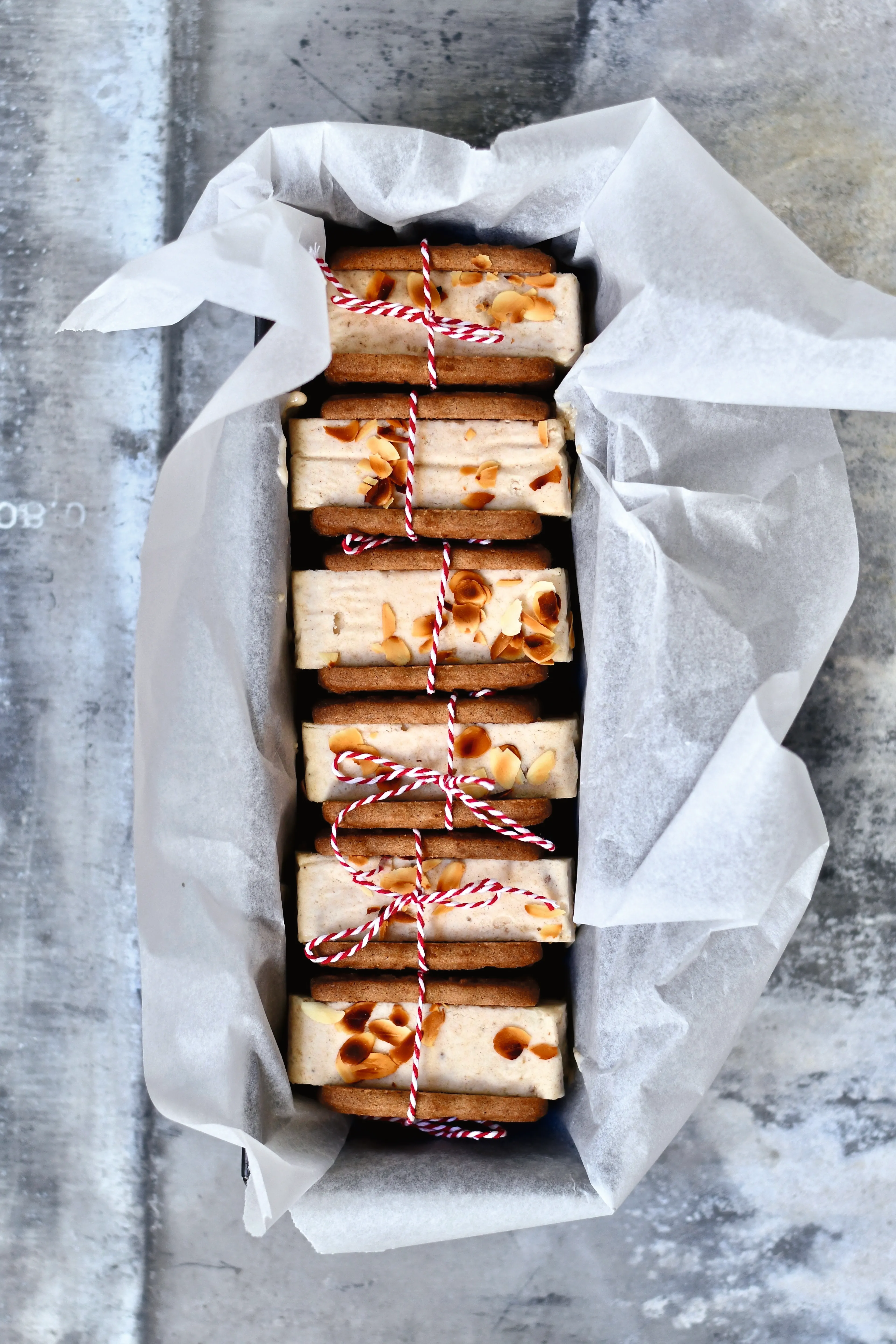 2. Snijd het ijs in tien plakken. Leg een plak ijs tussen twee speculaasjes en bind er met een feestelijk touwtje een strik omheen. Strooi er eventueel wat amandelschaafsel overheen.