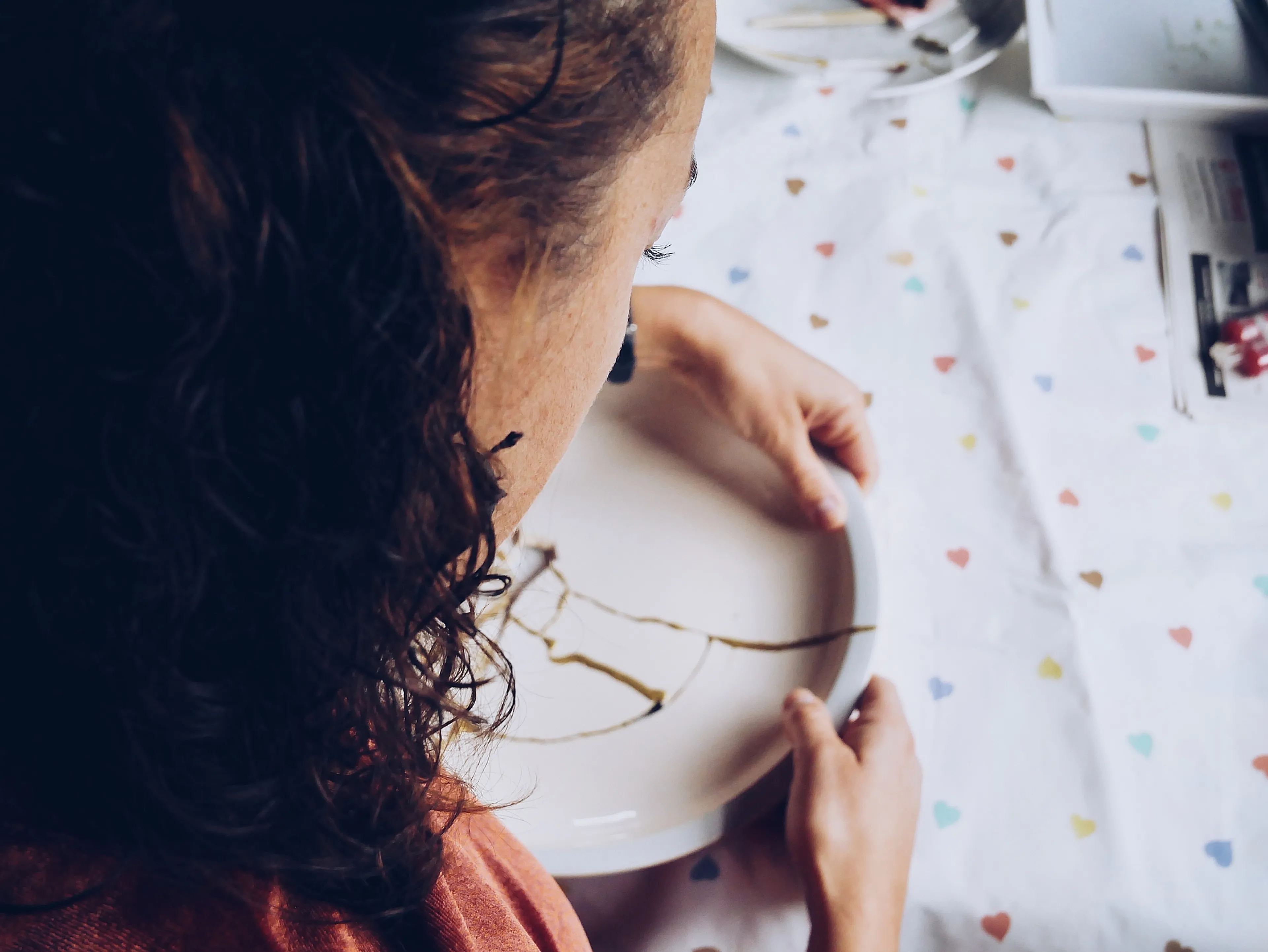 “In de periode dat het niet goed met me ging, vertelde m’n moeder over een Japanse traditie: als daar servies sneuvelt, gooien ze het niet weg, maar lijmen ze de gebroken stukken weer aan elkaar met goudlijm. Zo worden de breuklijnen onderdeel van de geschiedenis van het voorwerp, waardoor het nog waardevoller wordt. Als ik terugkijk op mijn proces, zie ik dat God alle scherven van mijn gebrokenheid weer bij elkaar heeft gepakt en heeft hersteld tot iets mooiers dan het was. Laatst heb ik met mijn moeder een bord kapot gegooid en alle scherven aan elkaar gelijmd met goudlijm. Dat was heel intens, en ook moeilijker dan ik dacht om het passend te krijgen. Dat bord wil ik in huis zetten als symbool voor die periode.”