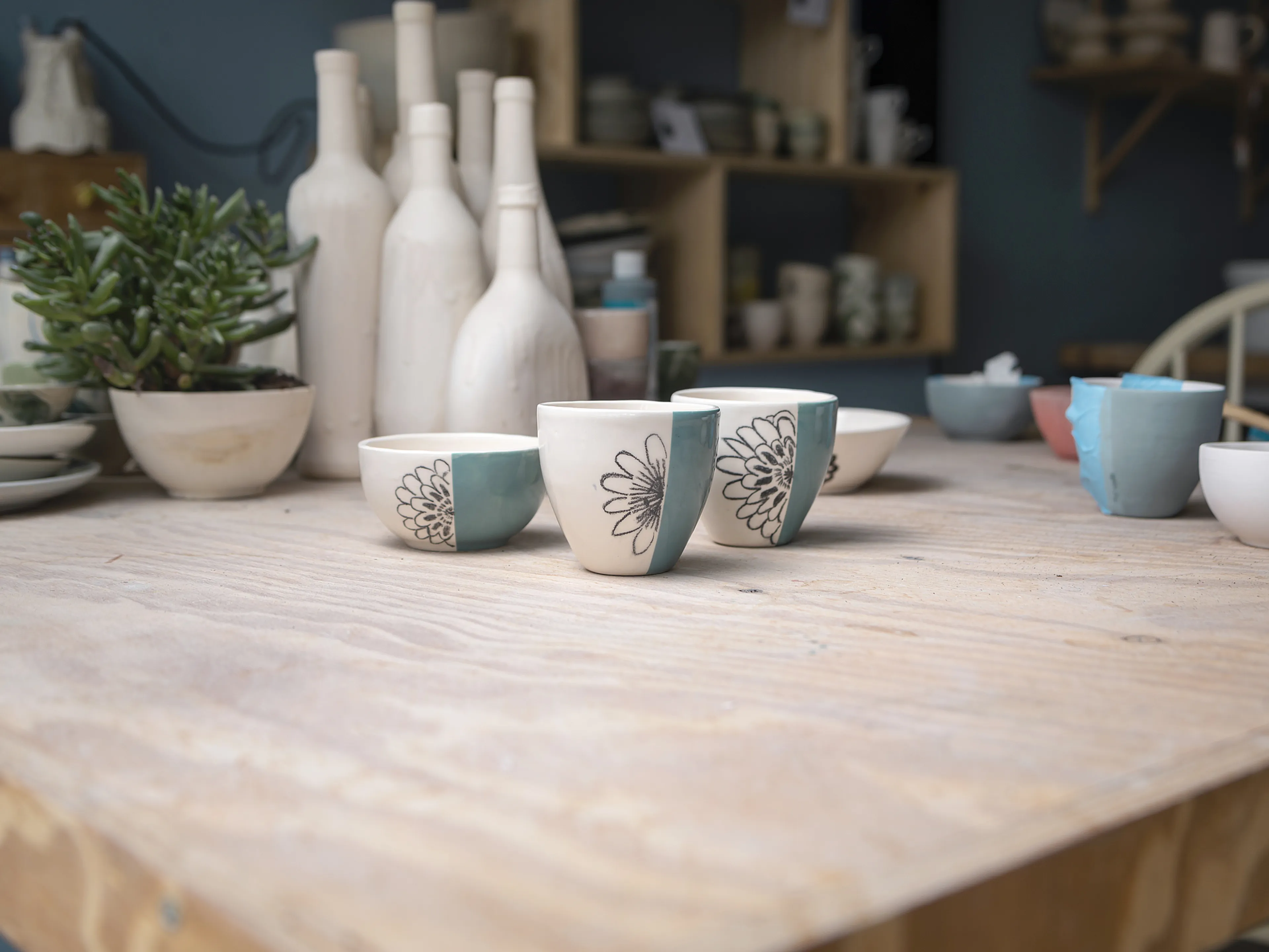 Gieten – dat is dus ook nog een optie. Zodra Esther me een paar voorbeelden laat zien van gegoten aardewerk, ben ik verkocht. De vormen zijn strak, dun, sierlijk – wat mij betreft hebben ze alles wat een servies mooi maakt. Neem bijvoorbeeld de serie die Esther als haar eigen lijn verkoopt in de winkel: kopjes gegoten in een mal van een plastic bekertje, versierd met een gouden randje of bloemdecoraties en verrijkt met een oortje. De grap is dat je het plastic bekertje er nog steeds in herkent.
