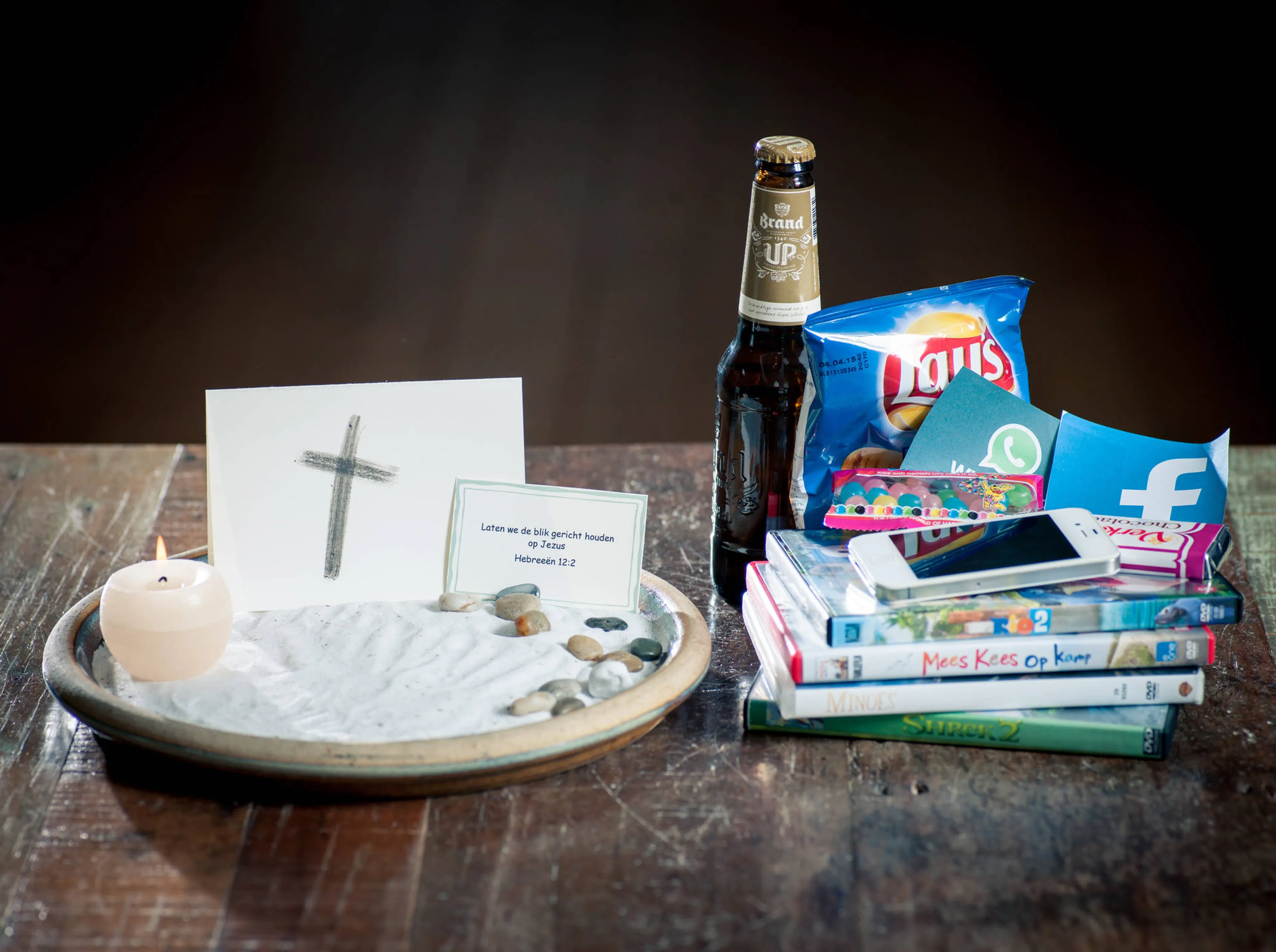 “Voor veel mensen is de veertigdagentijd een periode van vasten. Ook Jezus vastte veertig dagen, om klaar te zijn voor Zijn taak aan het kruis. Hij deed dat in de woestijn, vandaar het zand, dat ook staat voor leegte. Naast het bord kun je voorwerpen neerleggen die je tijdens die periode even wilt laten voor wat ze zijn. Want om echt aan Hem te denken, moet je soms wat dingen níet doen, zodat je ruimte hebt in je hoofd. Zoals in Hebreeën 12:2 staat: ‘Laten we de blik gericht houden op Jezus.’