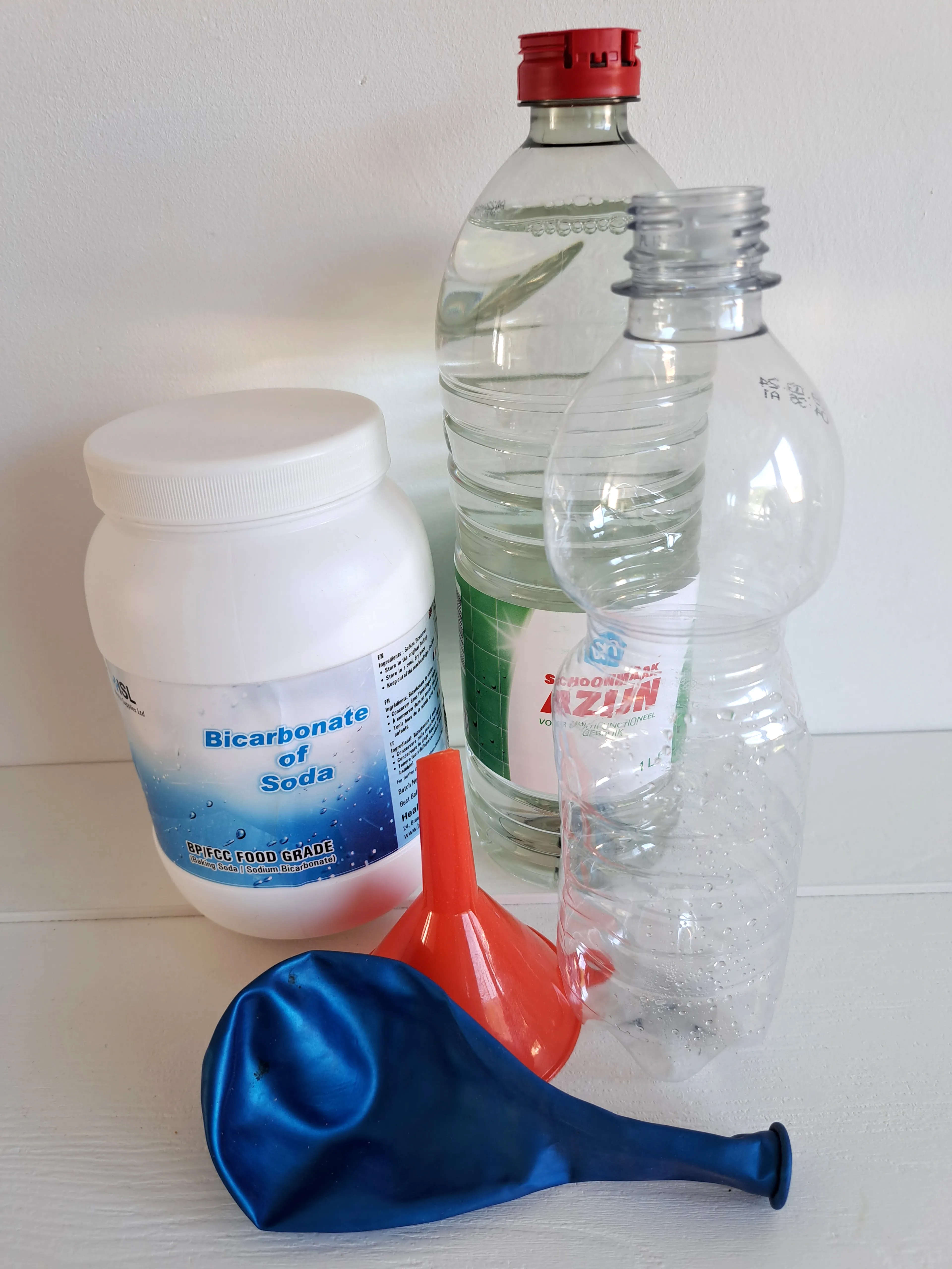Vul een lege fles met ongeveer vijf centimeter azijn. Blaas de ballon een paar keer goed op en laat hem dan weer leeglopen, zodat de ballon al een beetje uitgerekt is. Plaats de trechter in de opening van de ballon en vul de ballon met twee of drie theelepels bakpoeder. Maak de ballon vast aan de opening van de fles en laat het bakpoeder vanuit de ballon in de azijn in de fles vallen. Er ontstaat nu een chemische reactie. Koolzuurgas komt vrij en de ballon wordt vanuit het niets gevuld.