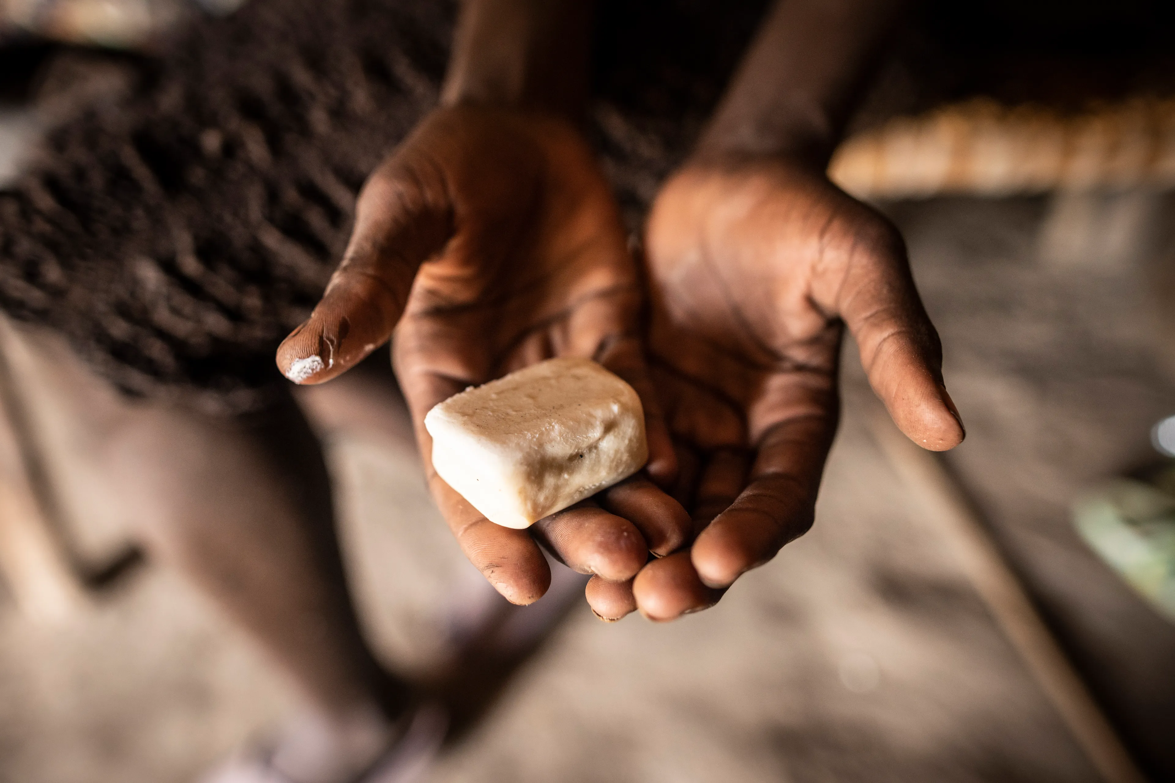 Valentino vertelt dat Mary een van de vrijwilligers is die hygiënepromotie in dit kamp doen. Ze krijgt daarvoor maandelijks wat extra stukken zeep. Dat lijkt misschien weinig, maar toch lichten haar ogen op als we vragen wat die zeep voor haar betekent. Mary pakt Valentino’s hand vast. “Zonder jullie hulp zou ik waarschijnlijk niet meer in leven zijn. Ik dank God er elke dag voor.”