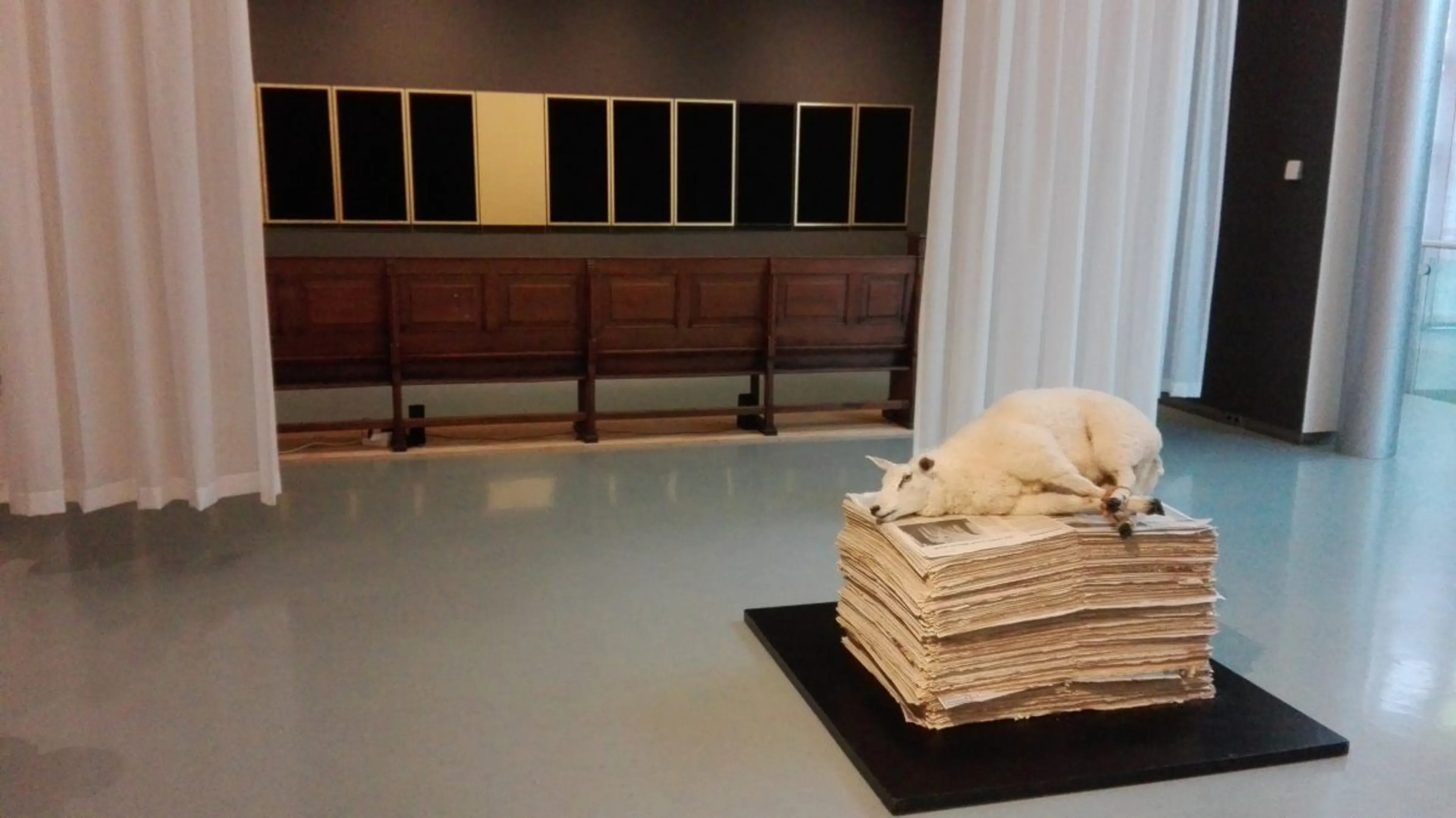 De eerste zaal van de tentoonstelling overvalt me. Het is verdeeld met luchtige, witte doeken om vluchtige heiligdommen te creëren waar de bezoeker aandachtig op zoek kan gaan naar de zin van het leven. Martijn Duifhuizens Het laatste avondmaal is een overweldigend, meditatief werk en ik merk dat mensen naast elkaar blijven zitten op de kerkbank om even onderdompeld te zijn in het geheel. Speciaal bij dit werk is het muziekstuk 7x modern en devout gecomponeerd door Kees Wisse. Dit eerste werk knalt meteen en geeft richting en smaak aan de tentoonstelling. Hier zijn we serieus samen aan het zoeken naar aandachtig te zijn.
