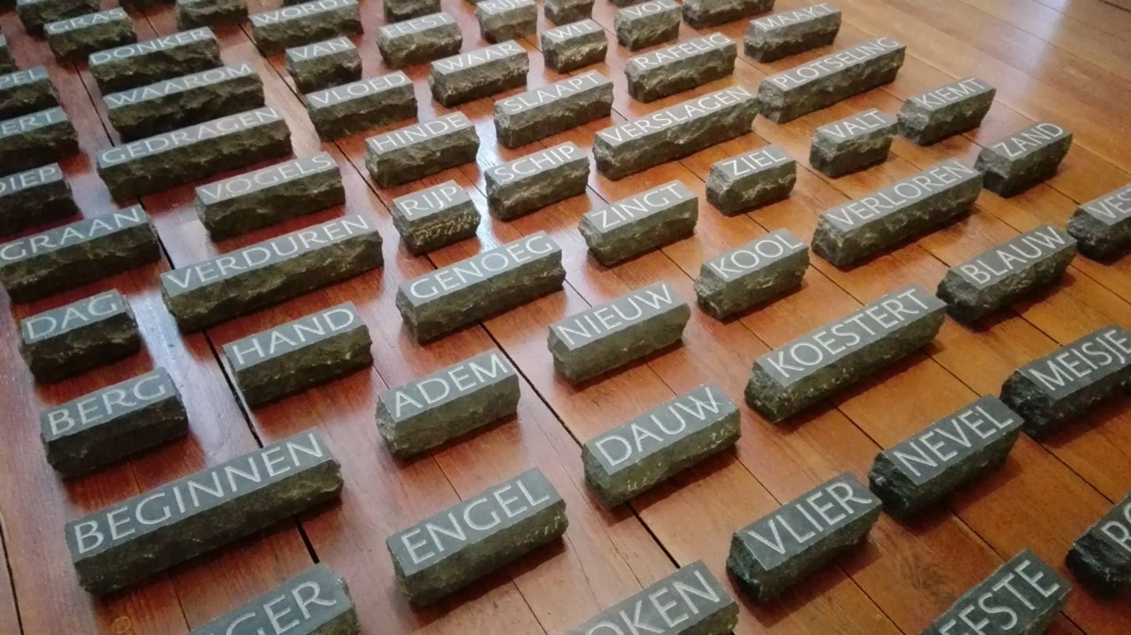 In de tweede deel maakt het werk Ik ben een woord van Anjet van Linge indruk. De installatie bestaat uit 100 in Ierse hardsteen gebijtelde woorden. Als er een verkocht is, gaat Van Linge een nieuw woord bijtelen, eentje die voor haar betekenis heeft. Weer een kunstenaar die met tijd en aandacht, en met hoogstaand vakmanschap, bezig is ‘een woord te scheppen’. Op een vernieuwende manier.