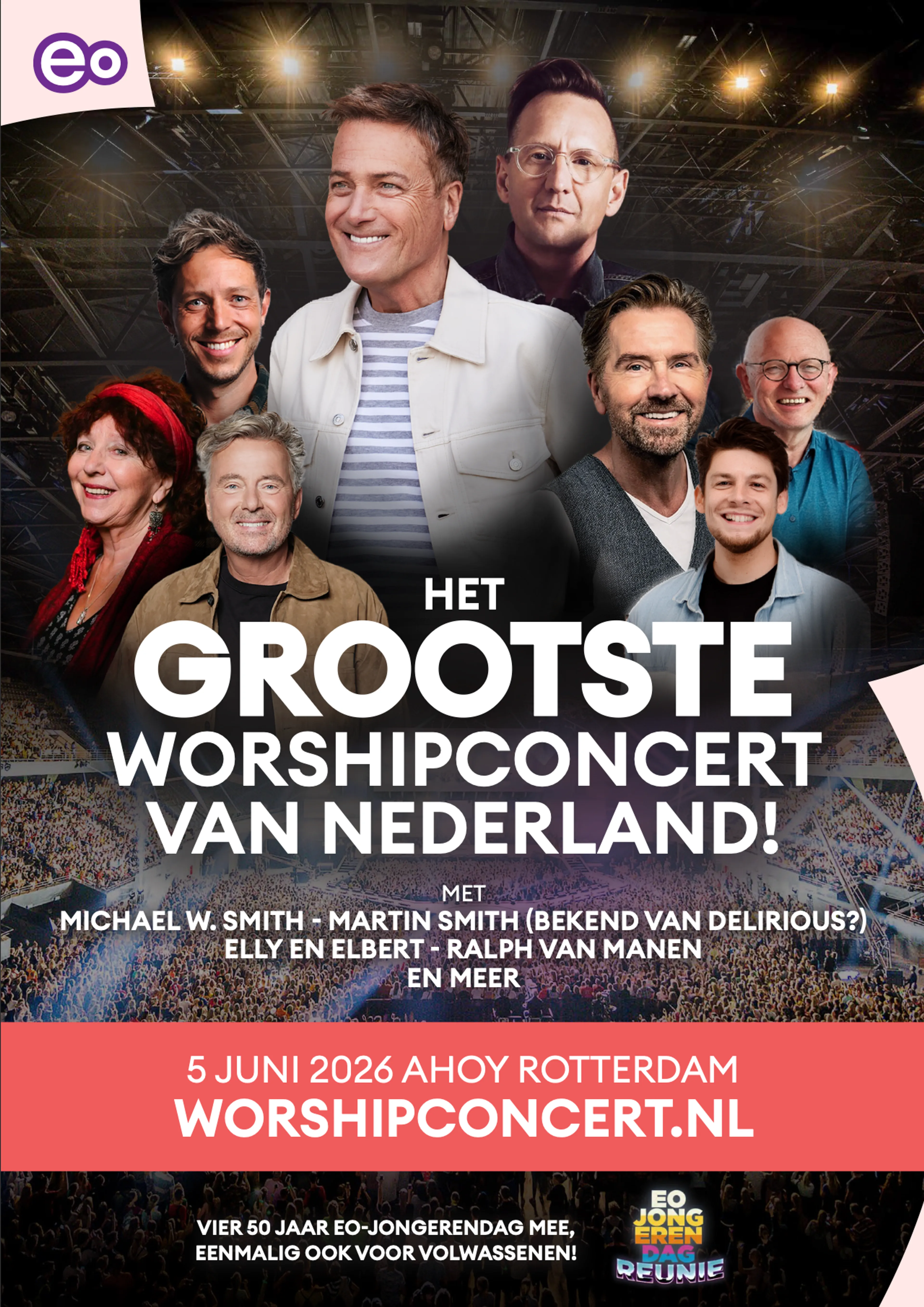 Op vrijdagavond 5 juni verandert Ahoy in het Grootste Worshipconcert van Nederland. Een unieke avond met de bekendste worshipartiesten van toen en nu! Michael W. Smith, Martin Smith (Delirious?), Ralph van Manen, de Ronduit Praiseband en Elly & Elbert komen allemaal langs.
