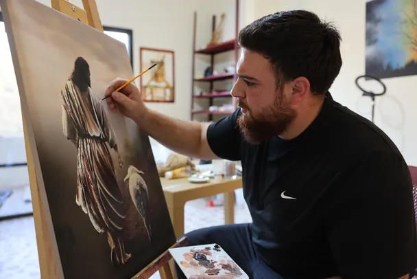 Terwijl er buiten gevechtsdrones overvliegen, schildert hij Jezus als de goede Herder.