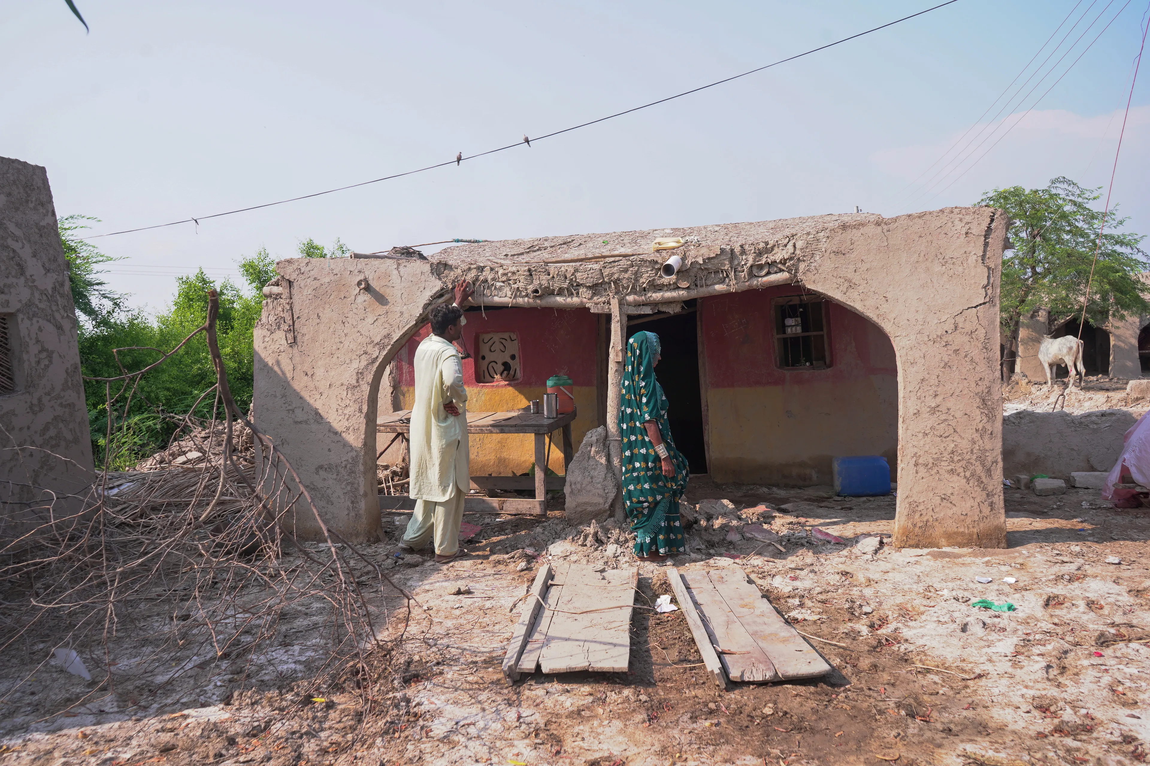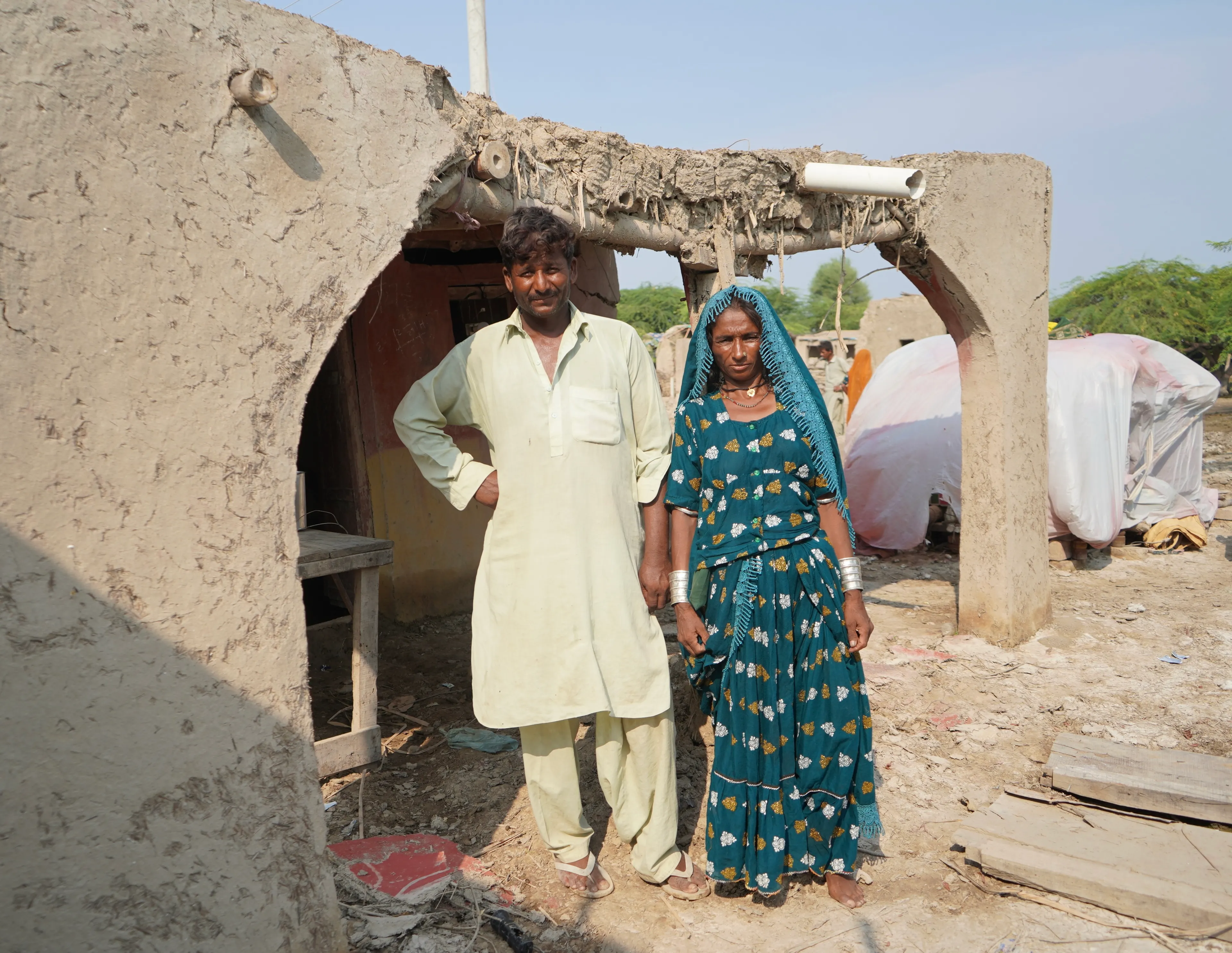 Onze partnerorganisatie bezocht Hero en zijn vrouw Gudi. Zij wonen in het dorp Lalo Kolhi. Hero strijkt met zijn hand over de beschadigde muren van hun huis en zegt: “We hebben zelf ons huis gebouwd. Het heeft ons meer dan twaalf maanden gekost. Midden in de nacht vernietigden de regen en overstroming in één klap alles wat we hadden. Drie van onze vijf geiten stierven doordat het dak instortte. De andere twee geiten konden we nog redden en ook wij hebben het gelukkig overleefd.” Zijn vrouw vult aan: “Het was verschrikkelijk. Iedereen in het dorp rende voor zijn leven.”